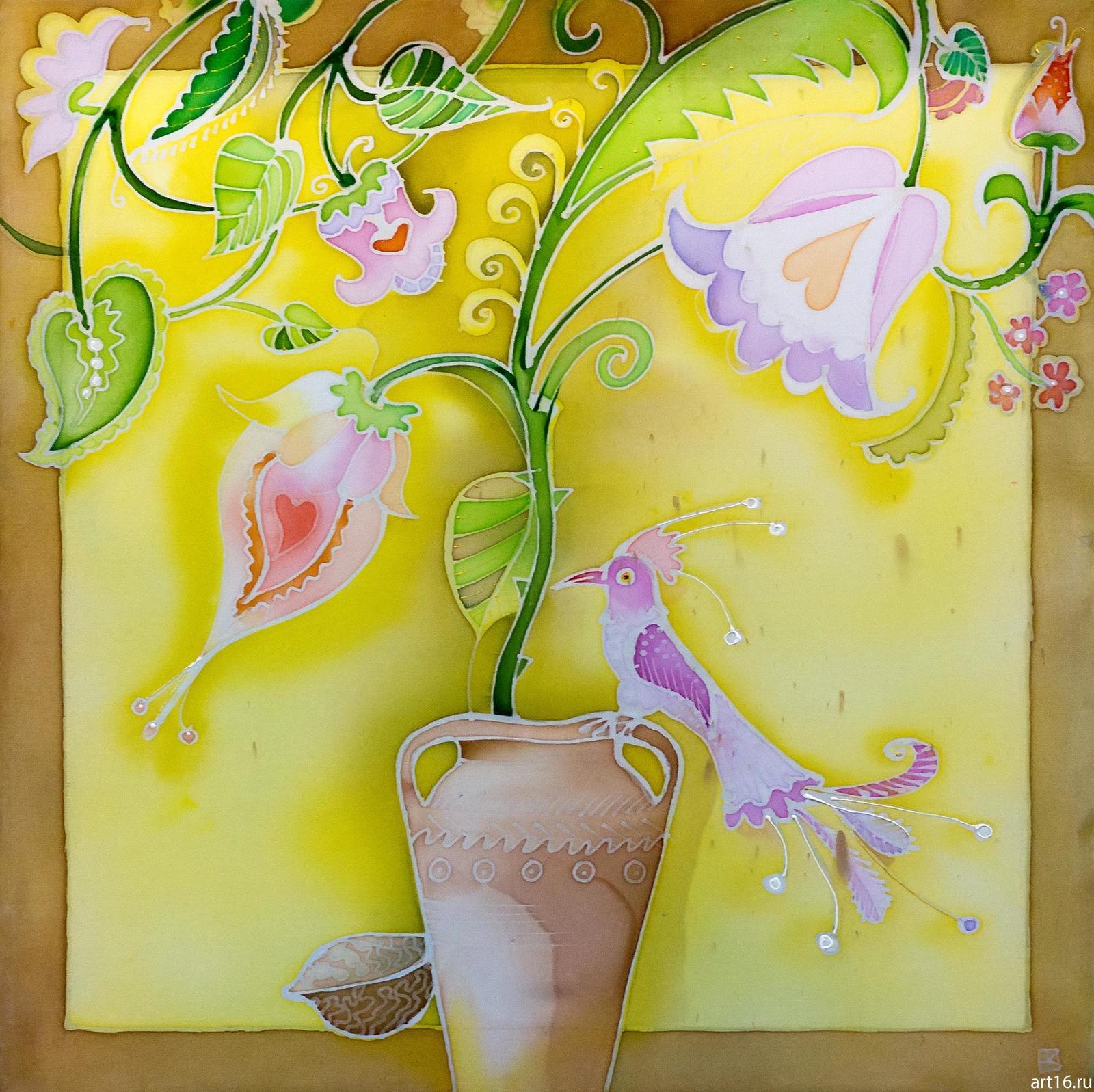 Еще в 2012 году на персональной выставке, где были представлены керамические и акварельные серии, батика и в помине не было. Сегодня в зале экспонируются тончайшие работы, выполненные в этой технике. Да еще какие! Потрясающие, наполненные гармонией и каким-то тихим женским счастьем, которое, впрочем, читается во всех ее работах. В выборе тем она придерживается своих инстинктов. Работы Нины Васильевны говорят о её тонкой душевной организации. В них сквозит доброе отношение к природе, людям.
