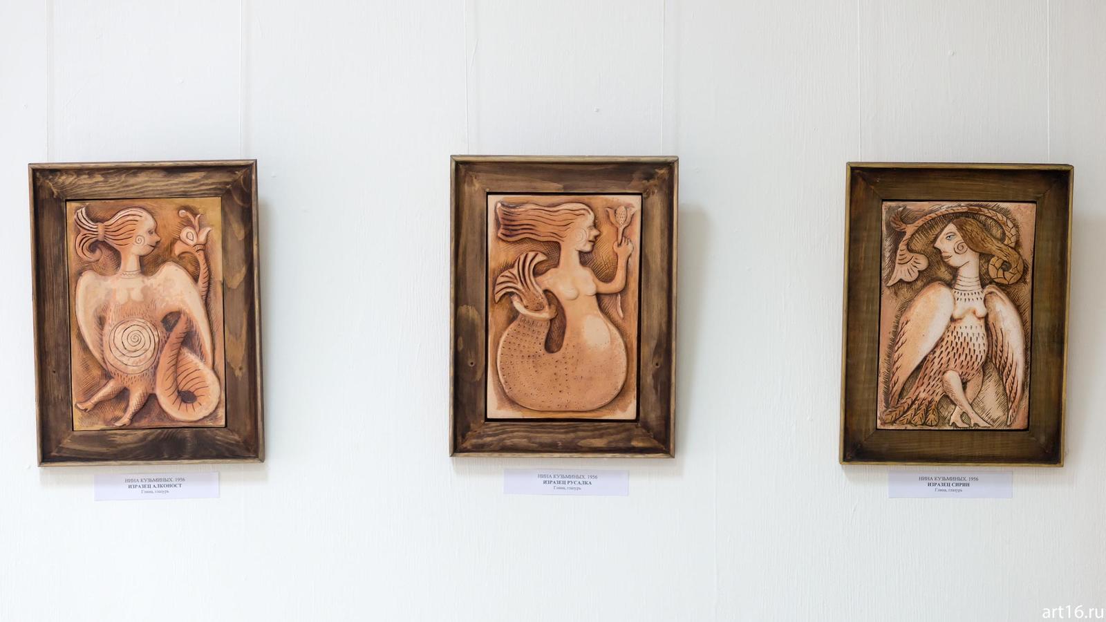 Фото №894930. Изразцы: Алконост; Русалка; Сирин. Нина Кузьминых, 1956глина, глазурь