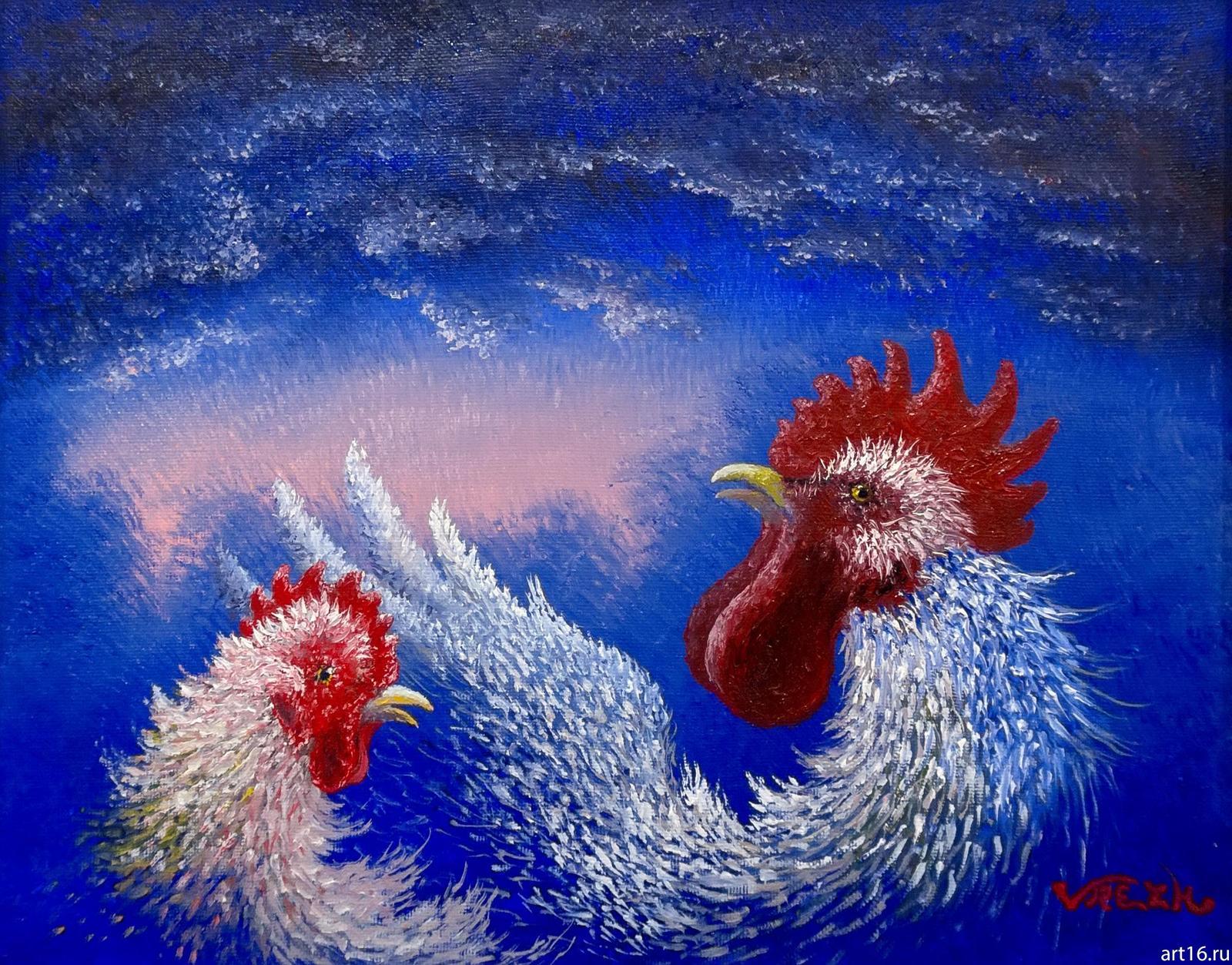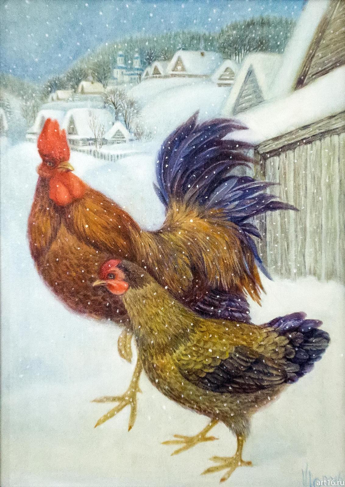 Если мысленно расширить рамки картины, то можно представить в ней разгуливающих по снегу петушков. А вот, кстати, и они! Такие разные и по характеру, и по технике исполнения.