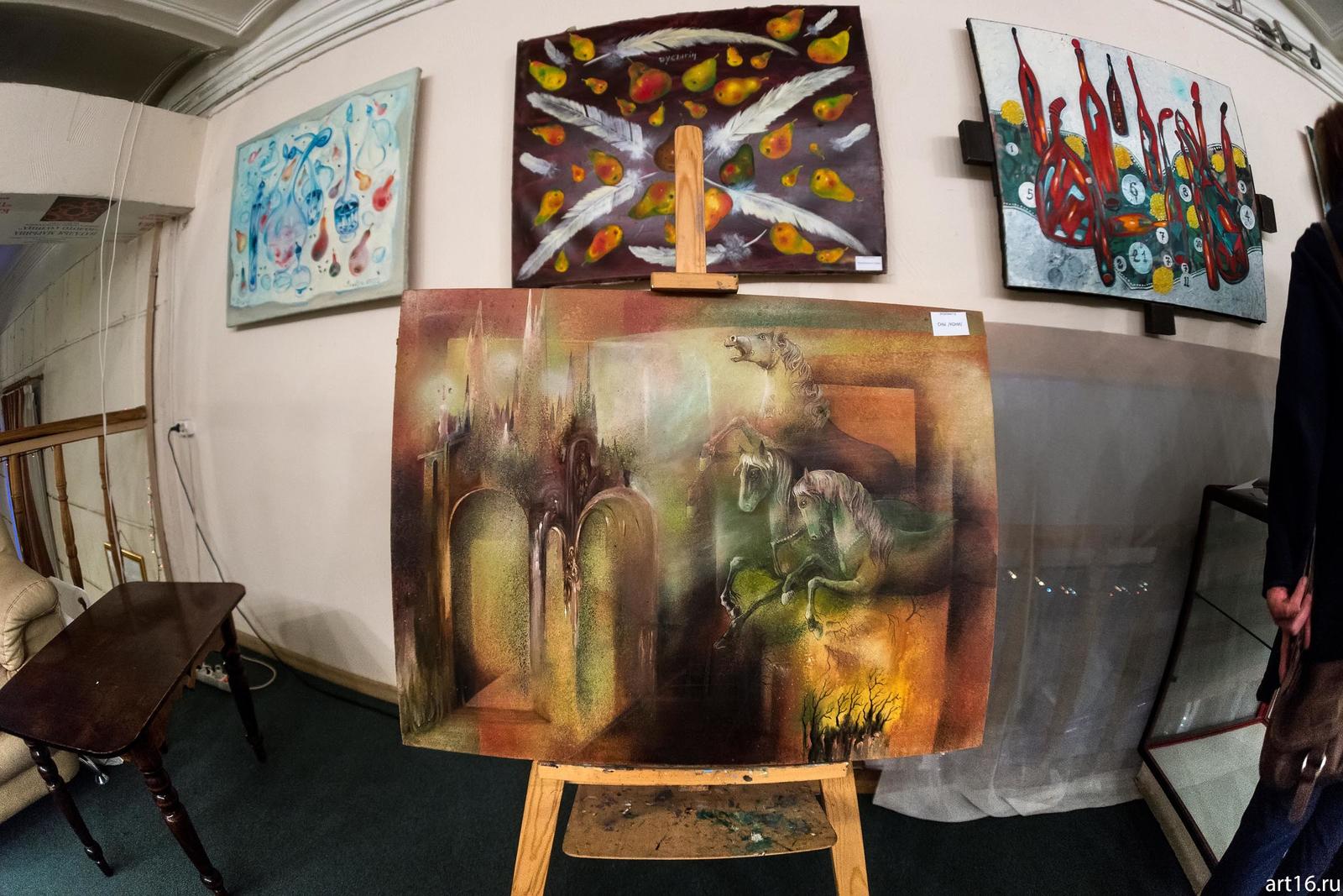 Фото №915602. Фрагмент экспозиции выставки А.Бусыгина, в центре картина «Сны / Кони»В Галерее «Эбиволь» собрались друзья художника и коллекционеры, почитатели его творчества. На выставке были «… все, все, все», кроме самого «Царя художников». [Александр Викторович идет на поправку после болезни и его друзья, для того чтобы поддержать дух товарища, организовали