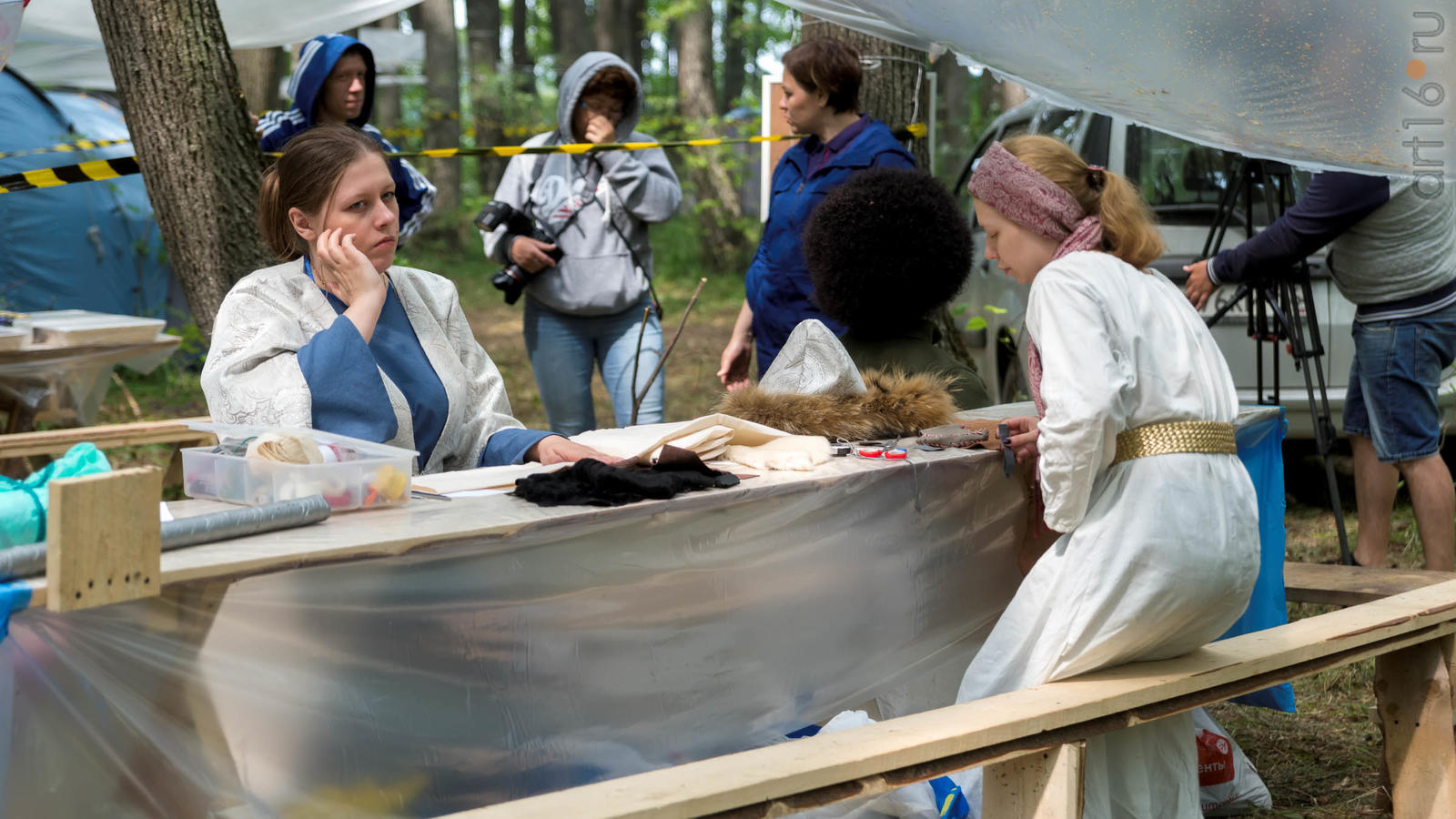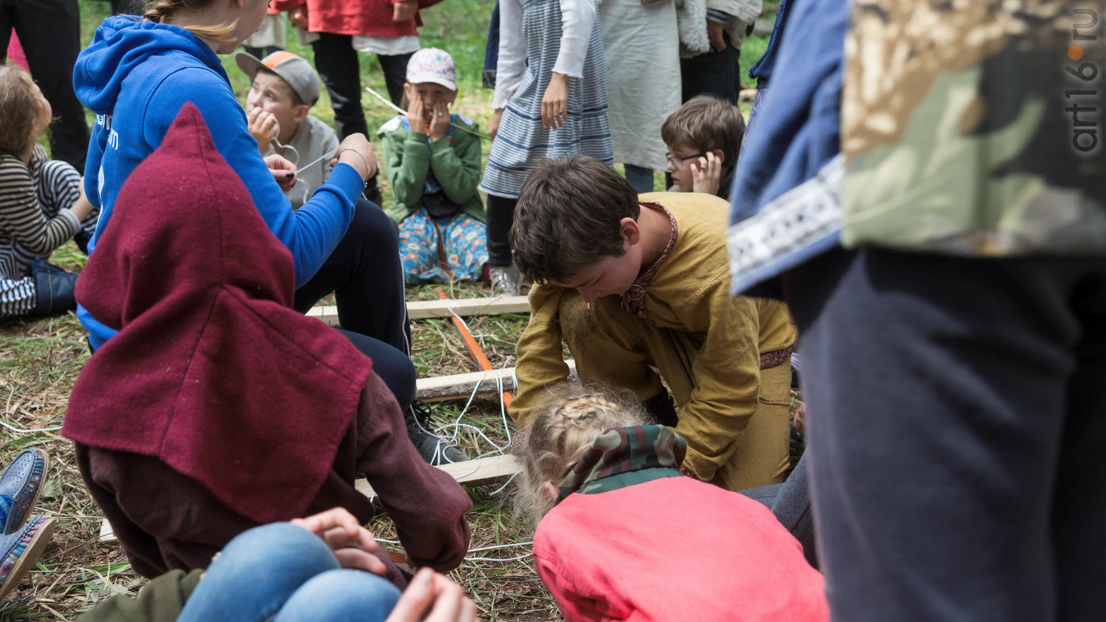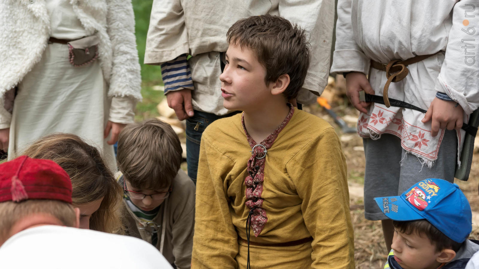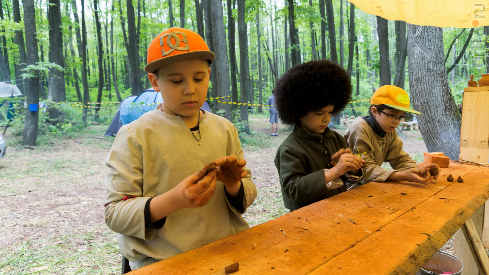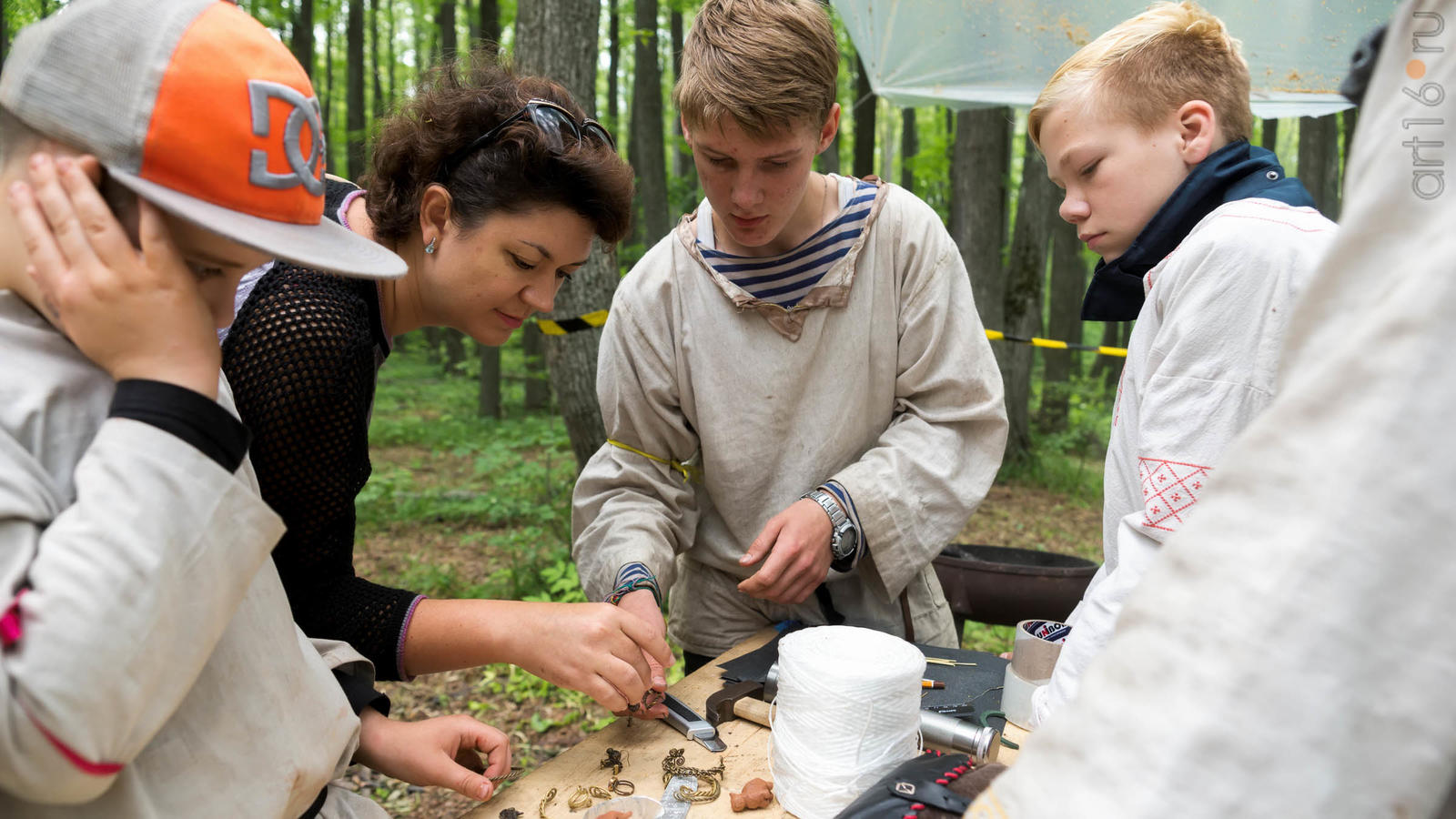 Фото №928853. Art16.ru Photo archiveВсе участники лагеря носят историческую одежду, заранее изготовленную по выложенным в контактной группе участников «Нового поколения» в Интернете. Их повседневная жизнь в лагере полна приключений и труда. Живут они по обозначенным правилам. «Выращивают ферму», изготавливают ювелирные украшения (кольца, браслеты, височные кольца, серьги), делают кожаные пояса, ремни, сумки, рисуют по воде в технике «Эбру». Получают знания по истории родного края.