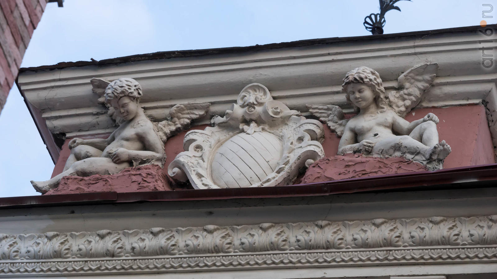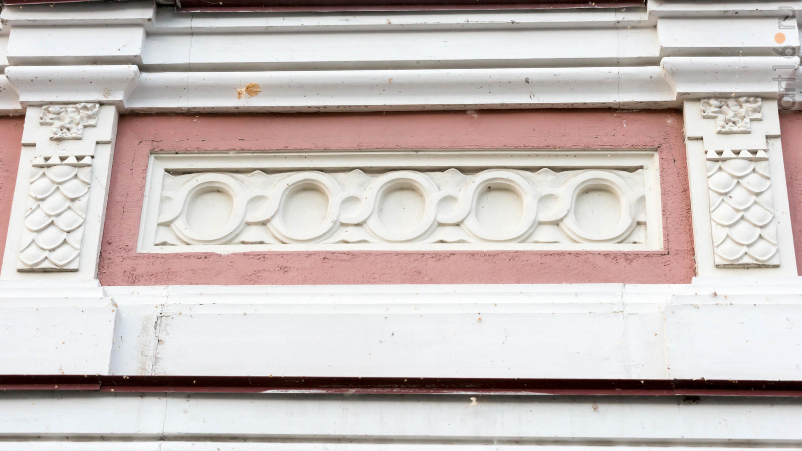 Фото №932312. Art16.ru Photo archiveДом Землянова - двухэтажное, кирпичное, рустованное здание. Главный фасад решен в симметричной композиции. Первый этаж разбит рядом арочных окон, обрамленных плоскими наличниками. Фасады насыщены эклектичным архитектурным декором. Фризовая плоскость оформлена модульонами, гирляндами, лепными розетками с маскаронами. На торцовом фасаде имеется балкон с ажурным металлическим ограждением. Два входа со стороны ул. Московской обрамлены козырьками на опорах.
