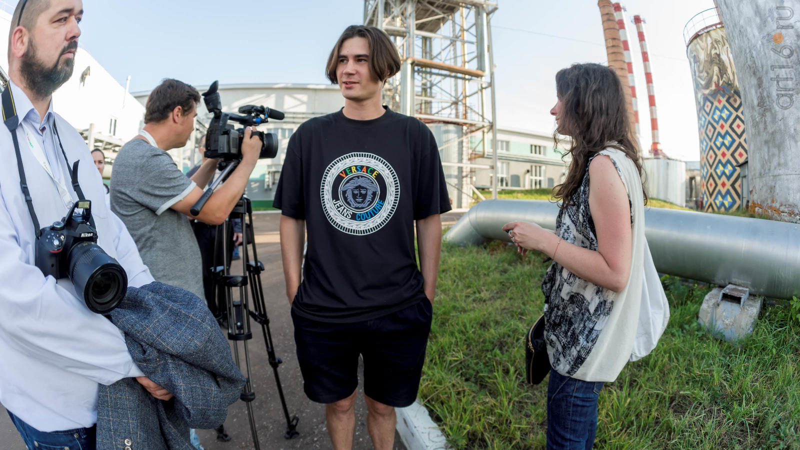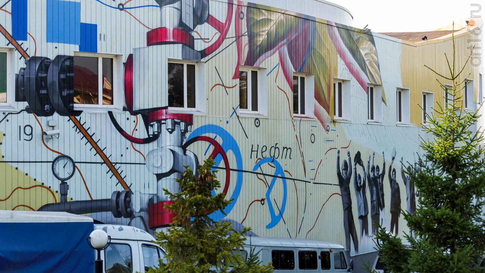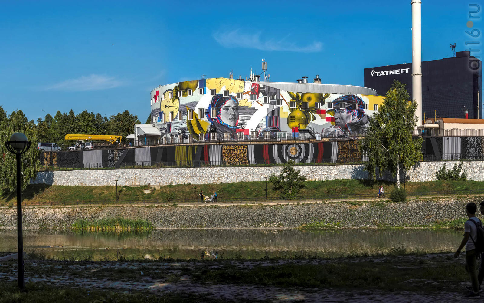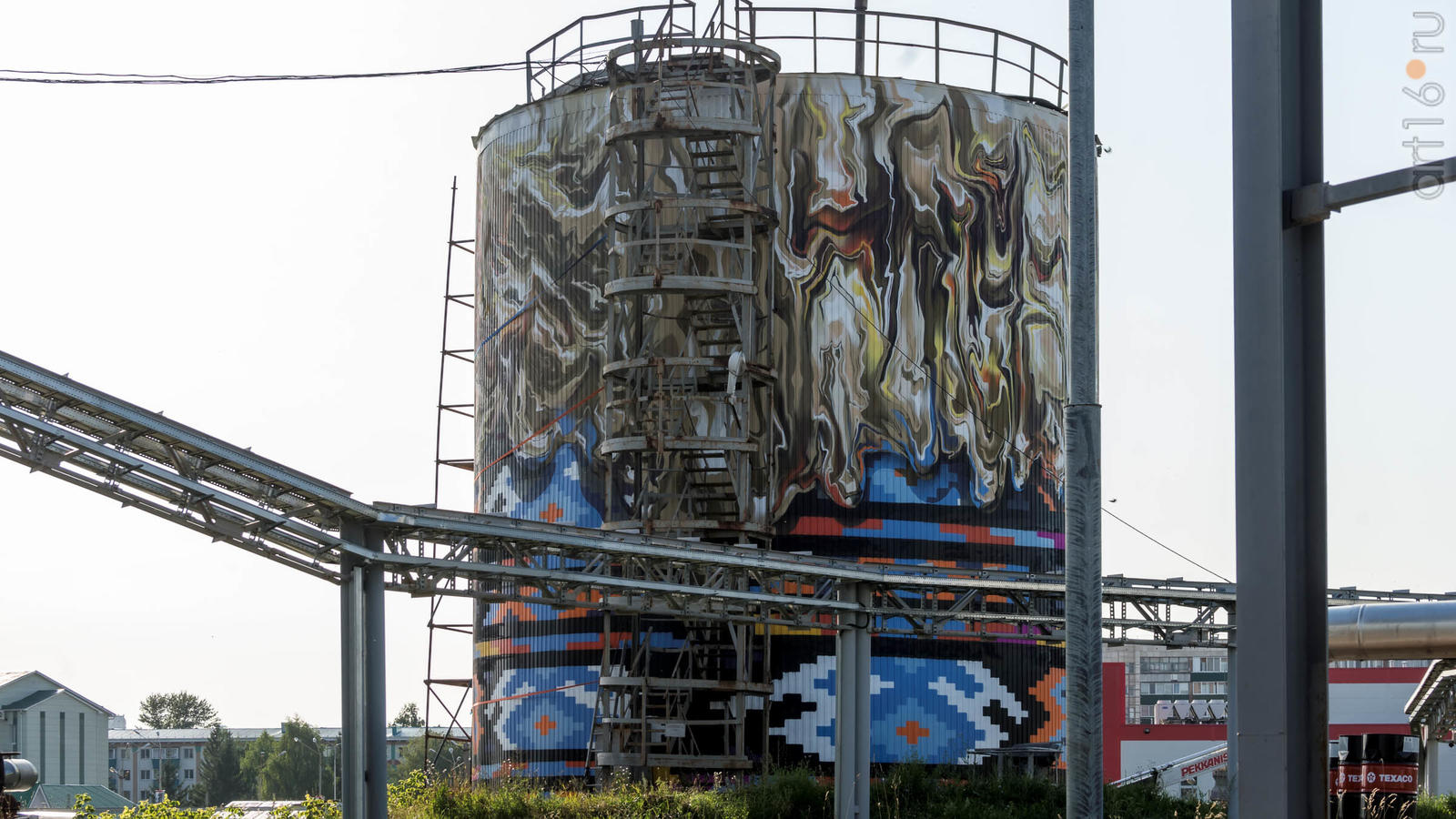 Фото №934054. Резервуары котельной АПТС на улицах Нефтяников и ГафиатуллинаИ последний арт-объект находится на выезде из Альметьевска в Набережные Челны. Его расписывают два итальянских художника. Идея росписи принадлежит Агостино Якурчи (Agostino Iacurci). Обычно вдохновение он черпает из событий обыденной жизни, изображая жителей городов в жизнерадостной и ироничной манере. В Альметьевске на фасаде дома №123 рождается другая история. Пока роспись еще не готова, но в том, что она будет связана с чайной церемонией. Это точно!