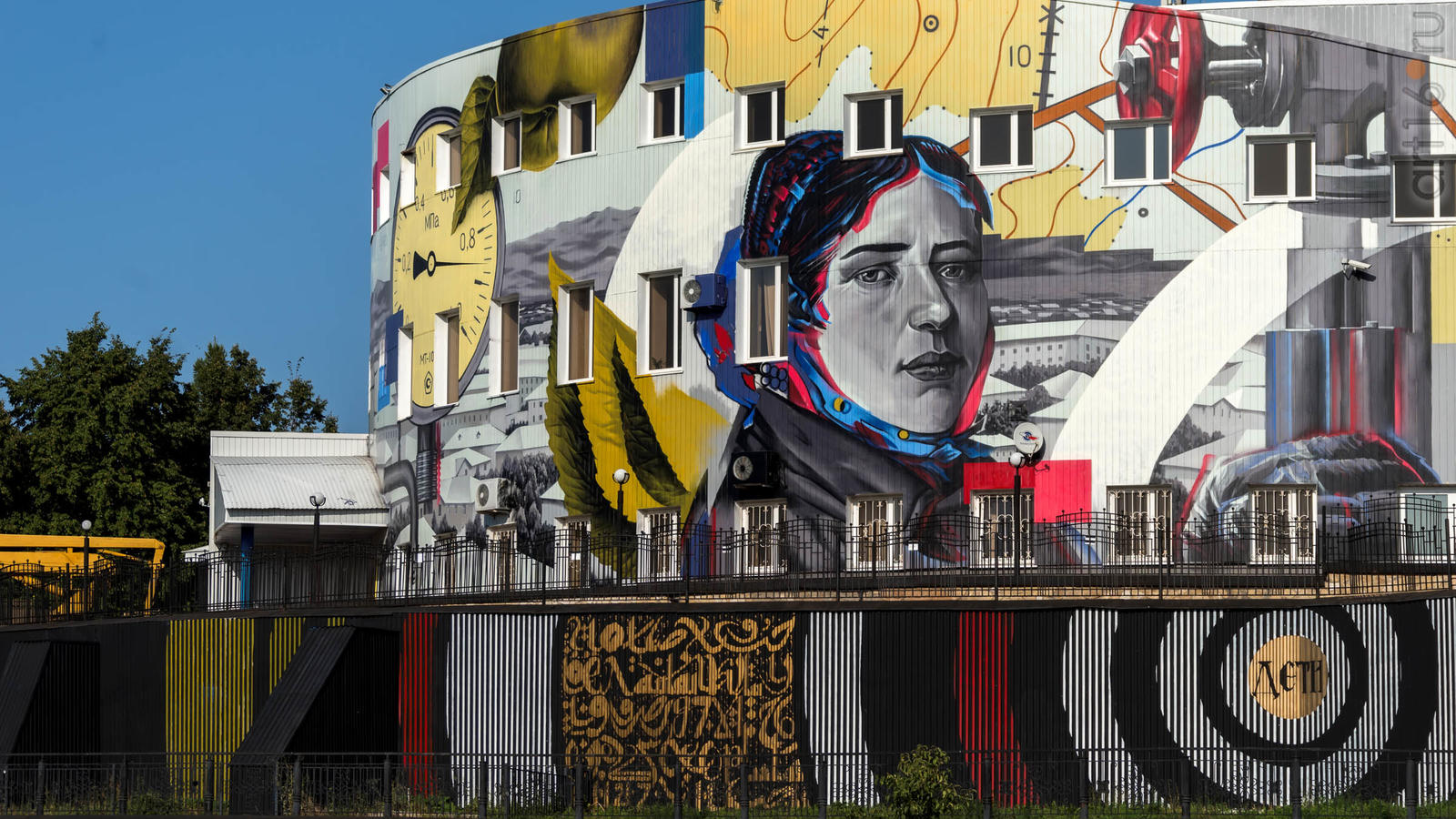 Фото №933944. Гараж ( РТ, Альметьевск, ул Ленина 75в)Кирилл Kreal для росписи резервуаров тщательно изучил татарский национальный узор по книге Фуада Валеева "Татарский национальный орнамент". Для него роспись это прежде всего работа с цветом и формой. Изображения на резервуарах (бочках) вместили воедино национальный компонент (узор) и символ города - черное золото нефти. Работа получилась колористически верно выверена.