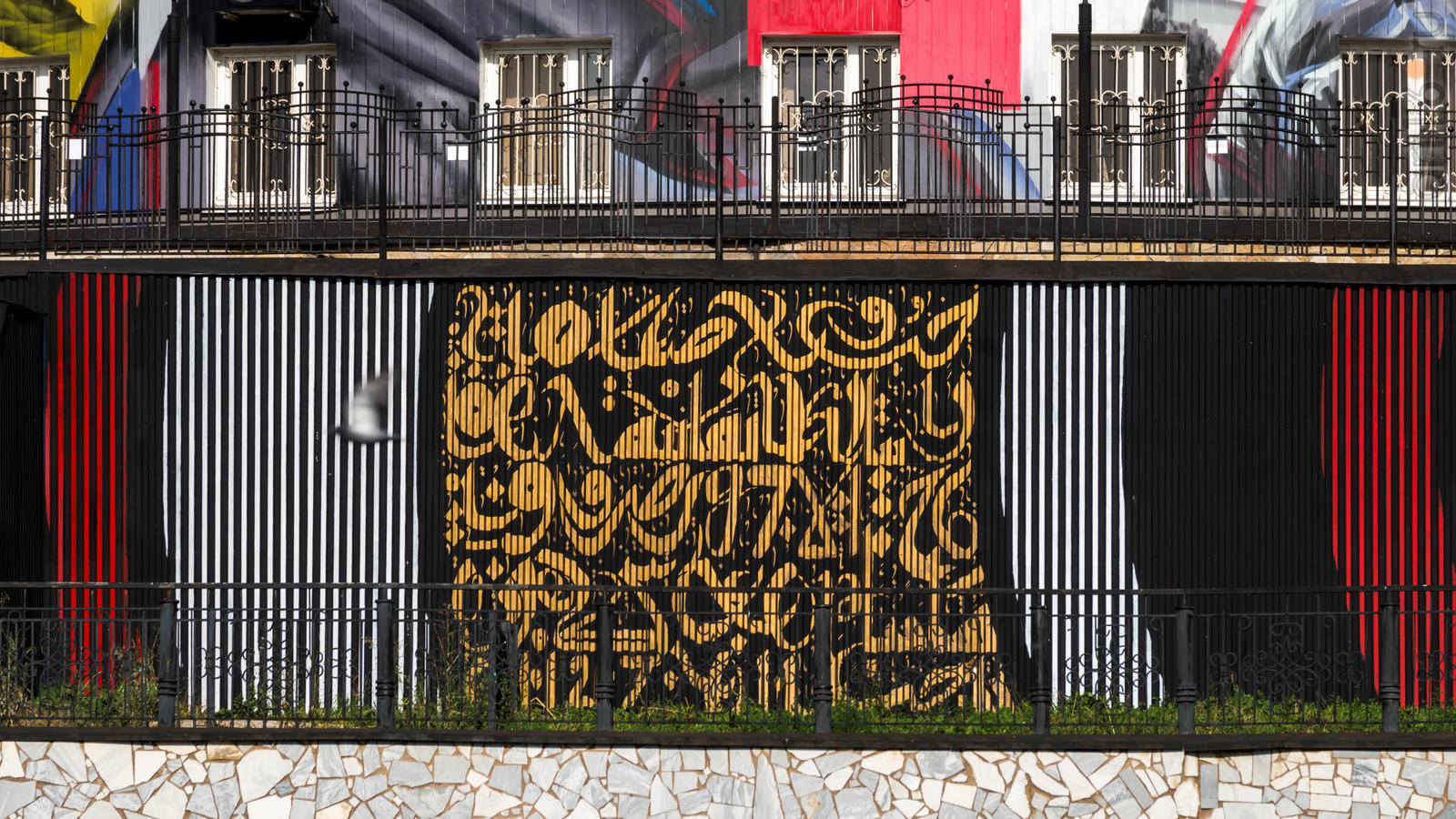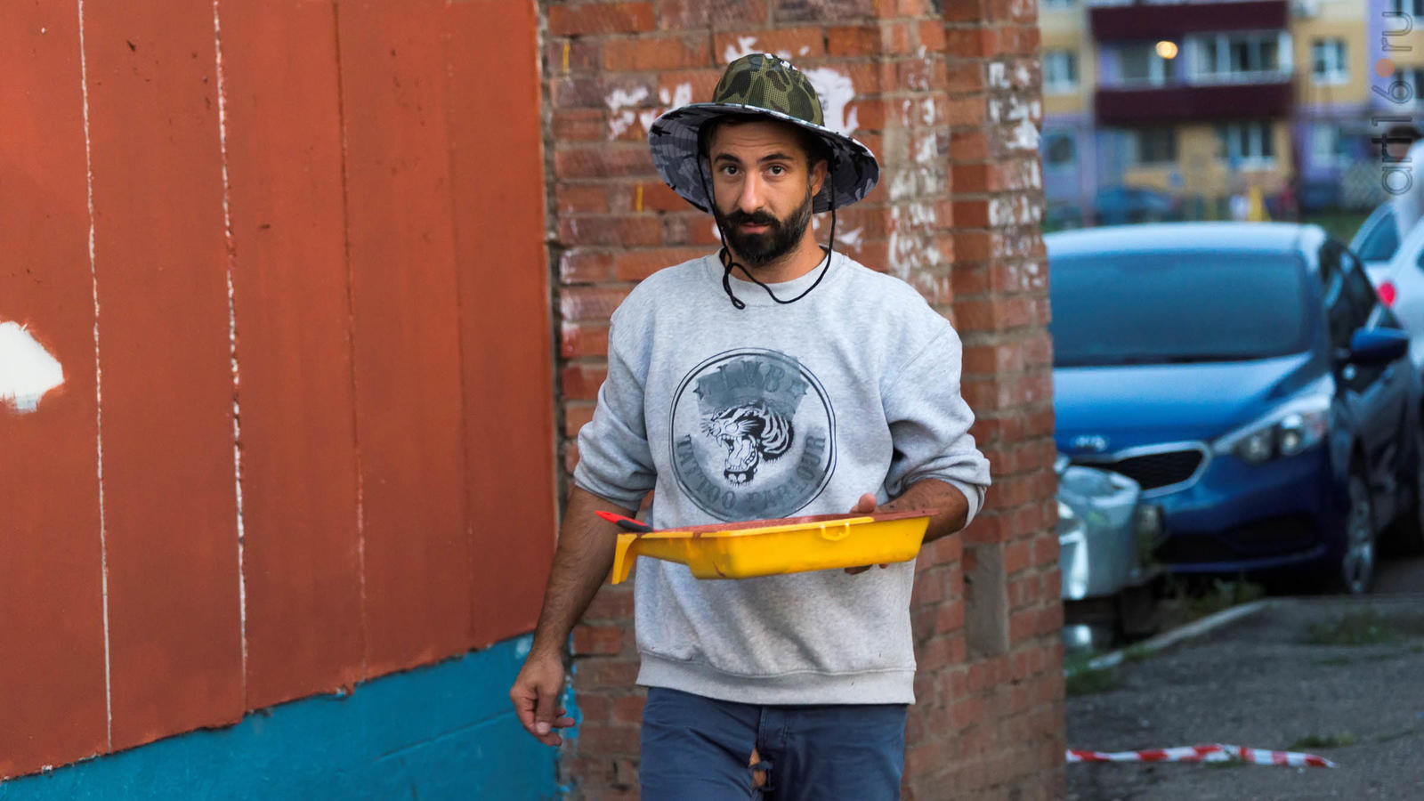 Фото №934161. Художники-муралисты Hoodo - Андрей Чередниченко, Ольга Дружина (Москва)Каллиграф Карим Джаббари занимался росписью сайдингового забора у парковки. В основе его росписи - татарская народная сказка "Золотые яблоки", мораль которой - Дети наше богатство, а семья - основная ценность. Глубину взаимопроникновения разных культур, сосредоточенных в Татарстане Карим Джаббари подчеркнул использовав в мурале забора не арабскую каллиграфию, а старотатарский письменный язык и древние славянские руны.