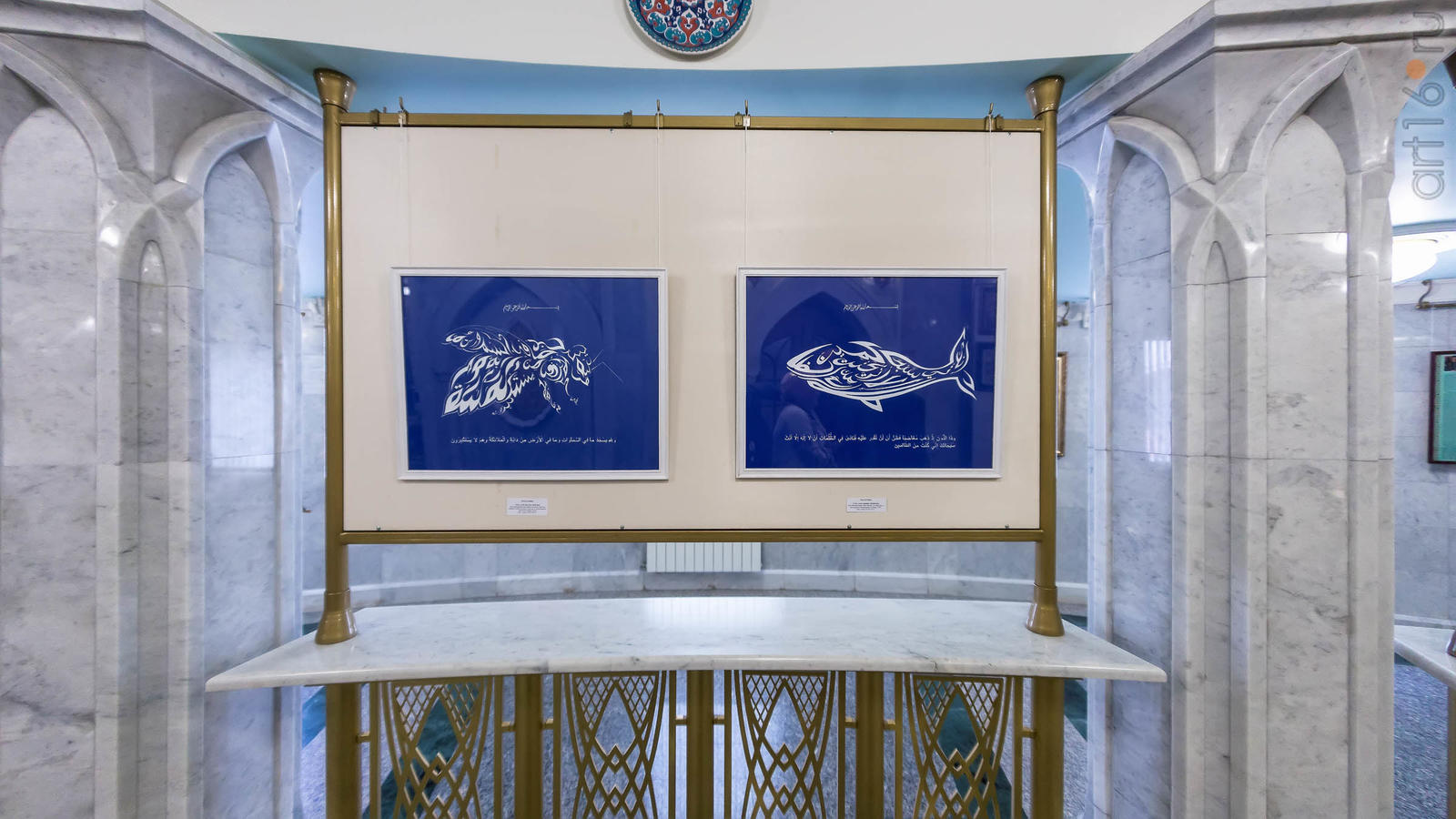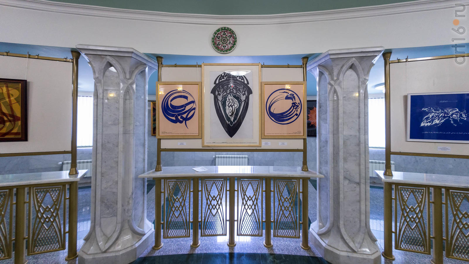 Фото №943276. Рустем ШамсутовЭкспозиция начинается с работы Гульназ Исмагиловой "Хич". В центре картины каллиграфическая надпись на арабском языке "Хич" - "Нет меня, есть только он (Создатель)". По полю - орнамент, выполненный в технике тезхип. Тезхип - от арабского слова «зэхэб», что означает золото или золочение. Создание орнамента очень кропотливая работа, требующая терпения и аккуратности. Золотой орнамент выполнен 22 или 24 пробой золота (золотой пылью), нанесен на бумагу тончайшей кистью. Есть несколько разновидностей орнамента: "руми", напоминающий клюв и крылья птицы; геометрические фигуры; "мюнхани" - кривые линии, накладываемые одна на другую; "хатаи" - цветочный орнамент; "саз йолу", стилизованный под листья и ветки; "тыг" - в форме крючков и завитков (вспомогательное украшательство). С искусством "Тезхип" Гульназ ознакомилась в Турции во время учебы. Она получила в государственном университете Эрджийес (г. Кайсери,Турция) теологическое образование на арабском и турецком языках, помимо этого завершила обучение в Университете общественности (Турция), брала уроки каллиграфии и тезхиба у признанных турецких мастеров. Ученица заслуженного художника России, лауреата Тукаевской премии Владимира Попова.