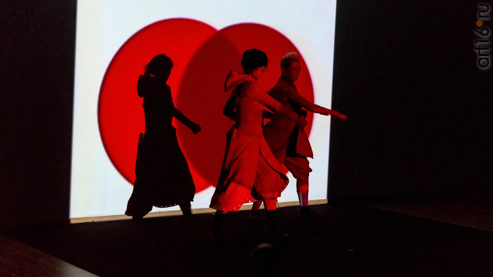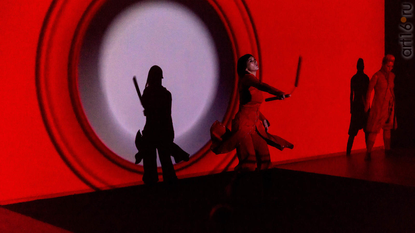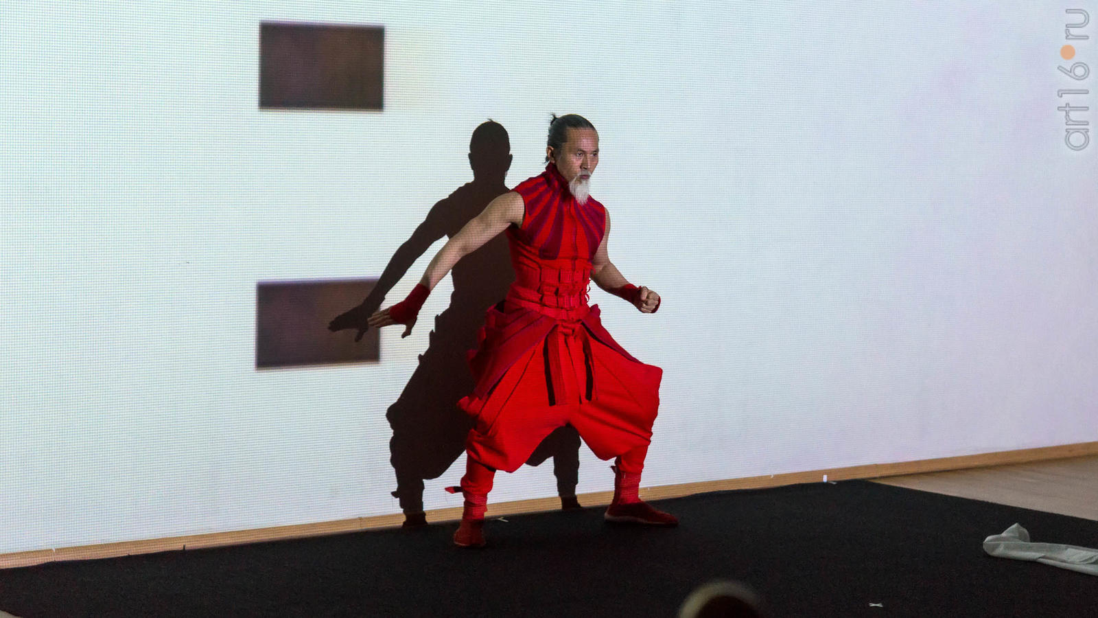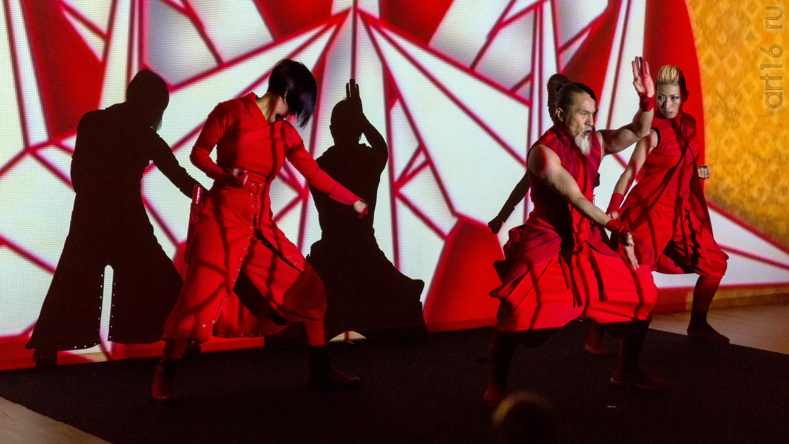 Фото №947146. Art16.ru Photo archiveЗрители увидели выступление японской группы ORIENTARHYTM (рук. Сакакура Кацуми) - динамичный аудио-визуальный и пластический перформанс, в котором движения актёров в ритме древнего японского боевого искусства каратэ-до, происходят на фоне видеоряда под звуковое сопровождение.