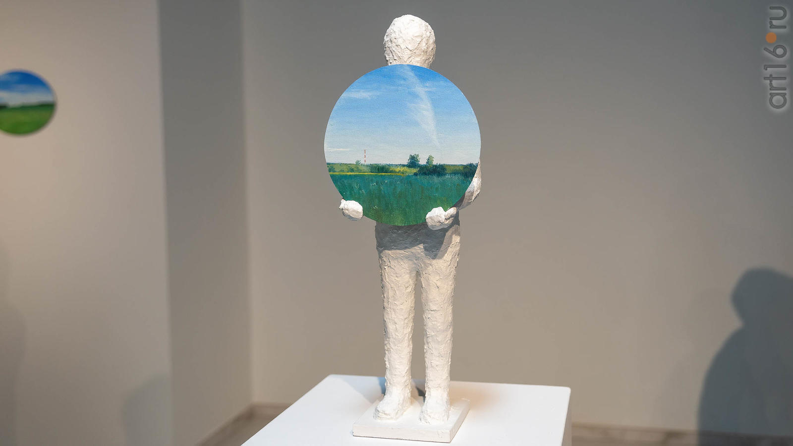Скульптура человека, держащего в руках щит с пейзажем («Пейзаж с ретранслятором №4») словно кричит : " Посмотри на картину, я внутри!..».