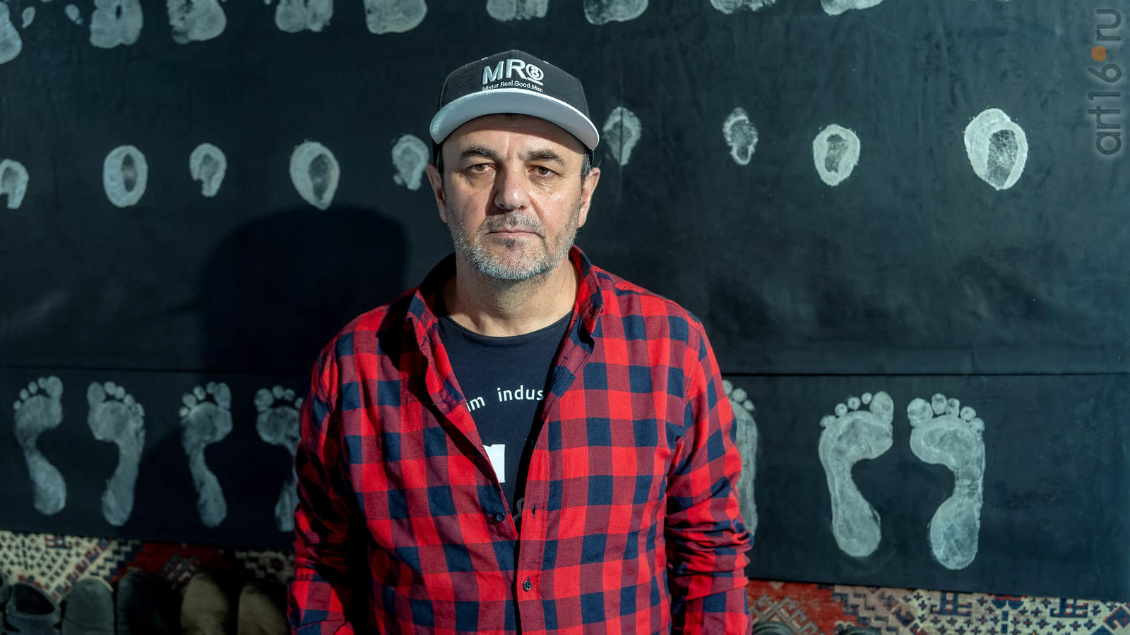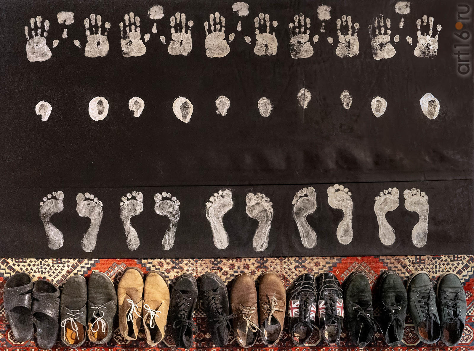 Выдержана стилизация. Нет ничего лишнего: ковер, резина, обувь стоит как в мечети. На резине - пять намазов Аладдина, его тактильные прикосновения, белые следы на черном поле.