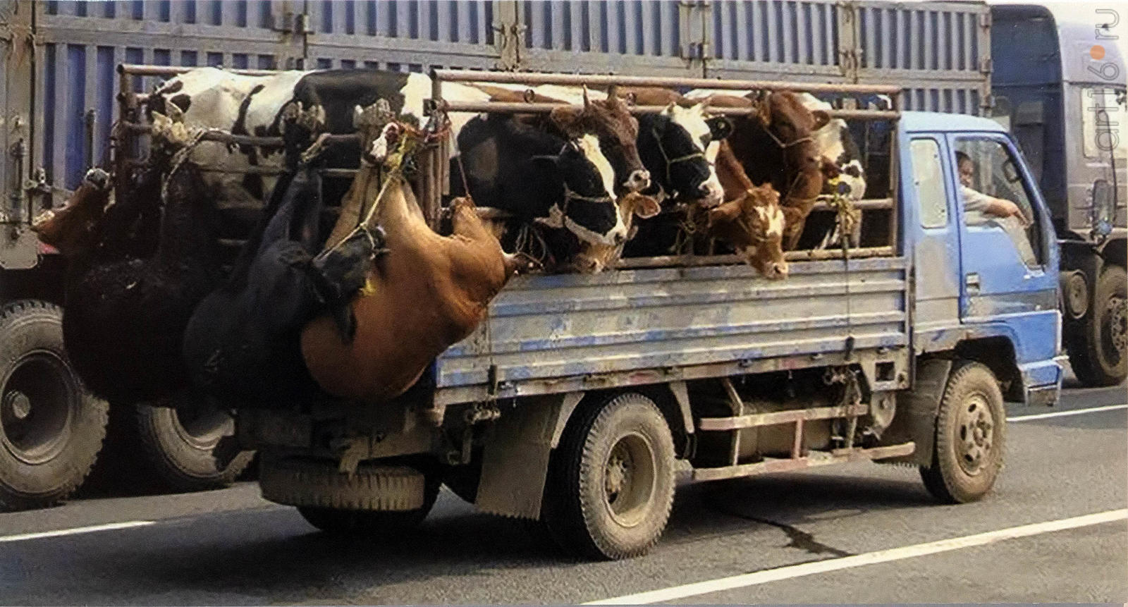 Фото №958610. Фотография. Автор неизвестен. Вторая половина XX века — Так вести на убой скот могут люди, потерявшие свои корни. Ради денег, наживы они набивают в грузовик огромное число коров, тех, кто не поместился, подвешивают за бортом. Это жестоко и безнравственно. Создавая произведения, я не забываю о том, что это д.б. не литературное высказывание. Не конкретно, а иносказательно довожу до зрителя информацию. Если говорить прямолинейно, то произведение будет слабым — считает Аладдин Гарунов — rартина написана не традиционным академическим способом, а в форме, скорее, упрощенной, ближе к трафарету, как СМИ, газета. Там дают некую маленькую информацию быстро, также как моя техника живописи в этом произведении.