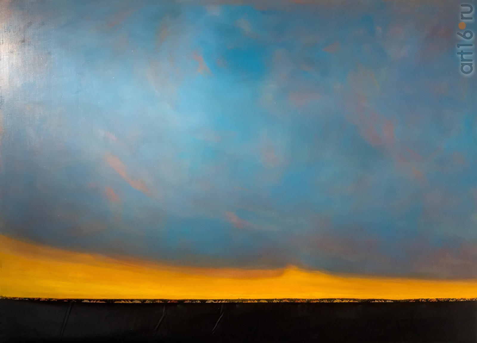 На выставке обращает на себя внимание пейзаж, выполненный нетрадиционным способом. Внизу резина, из под которой выглядывает ковер. Написанная полностью картина, по мнению автора, была бы банальна. А .Гарунов придает ей новую форму элементами арт-объектности: резина это ассоциация с нефтью, ковер, — может быть, с землей. Важны в картине пропорции: внизу узкая полоса земли, затем оранжевое небо и большое пространство свободного ухода через небо в космос. Сам художник говорит об арт-объекте, как о "присутствии пейзажа".