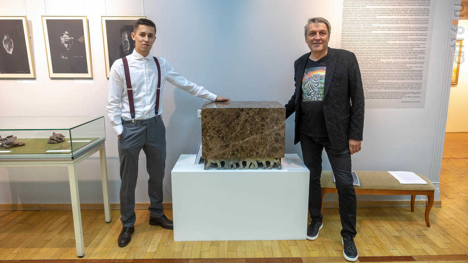 Фото №961110. Сабиров Альфиз, Шаймарданов Альфрид возле работы «Тайна. Императорские львы»Бронза, импраторский мрамор, литье, 2019. 50х65х45
