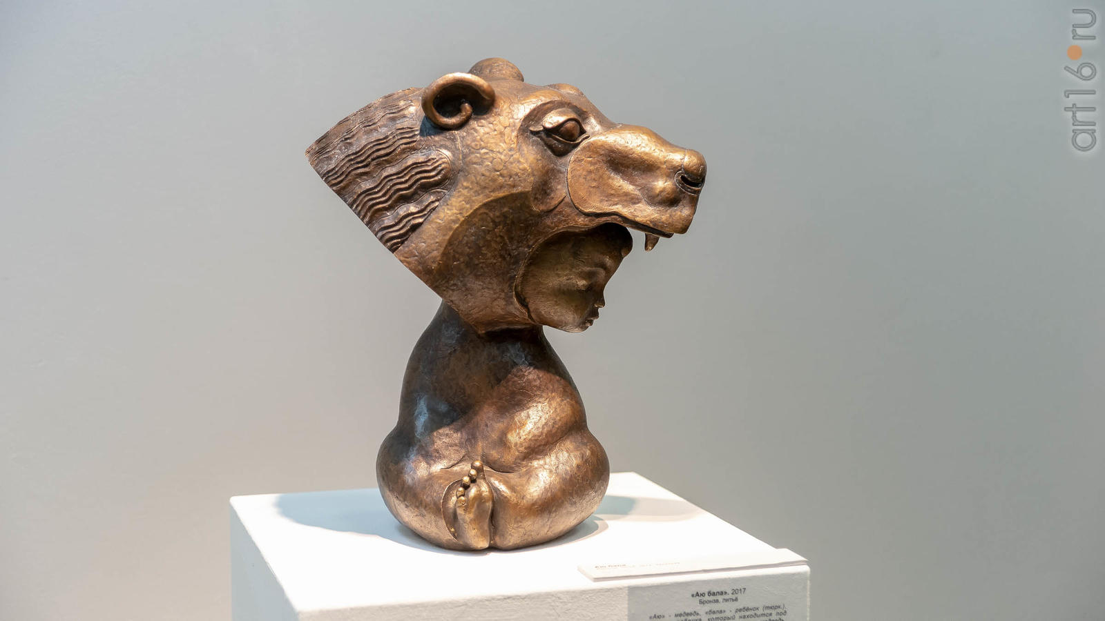 — «Аю бала» — это символ ребенка, который находится под защитой. Охранителем является медведь, сильное животное. Ребенок будто окутан панцирем, броней. Сам образ навеян следующим, в детстве я постоянно слышал от родителей бабушек и дедушек фразы: «Будь сильным как медведь», «Будь смелым как медведь». Уверен в том, что многим детям так говорили, когда за ними ухаживали, таким образом желали им силы и здоровья. «Будь сильным как «Аю бала», сильным не только физически, но и духовно. — рассказывает Альфиз и продолжает — В основе многих моих работ тюркские элементы. Интересно рассматривать представленную историю через формат мифов и легенд, через систему мифологии. Потому как в каждой работе, истории присутствуют свои герои, свои боги. Они по-своему между собой взаимодействуют, каждая - имеет свои корни. Здесь можно постараться отыскать древние коды и раскрыть тайну, а через знакомство с выставкой найти для себя ответы на многие вопросы: «Кто мы? Откуда пришли? Куда мы идем?».