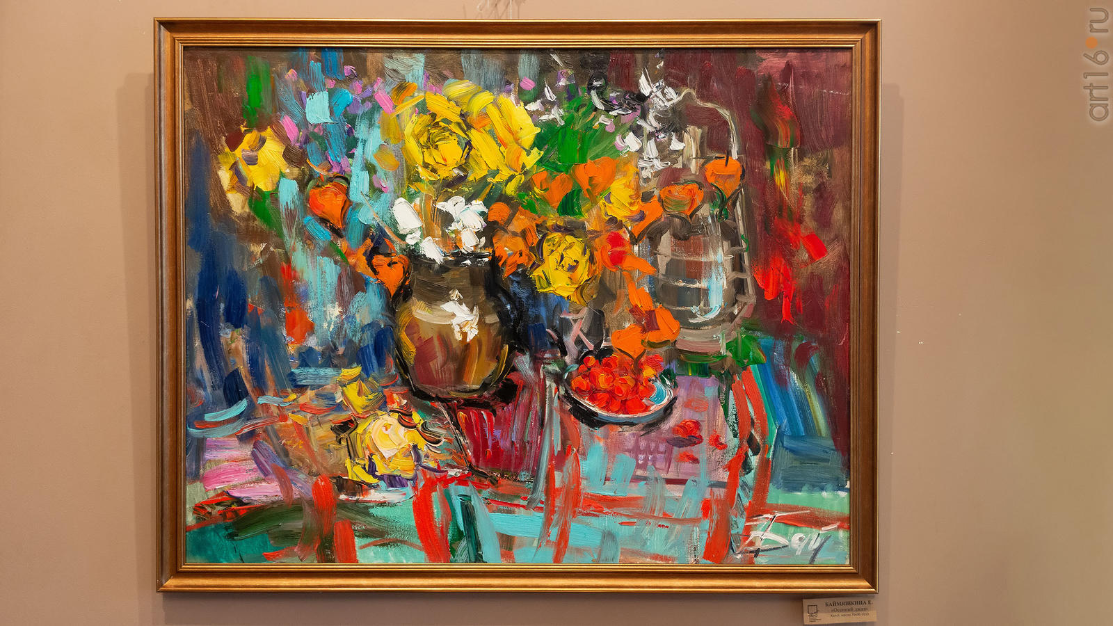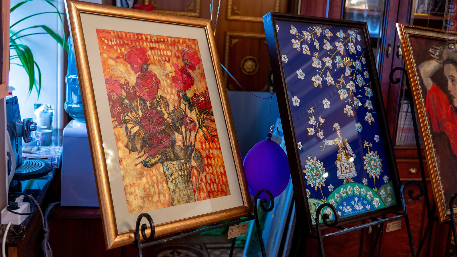 Экспрессивная, насыщенная картина Елены Баймяшкиной «Осенний джаз», «Цветочная рапсодия» Ларисы Исанбет, «Букет Анны Федоровой, цветочная композиция Елены Острой наполнены тонкой женской энергией и создают атмосферу праздника.