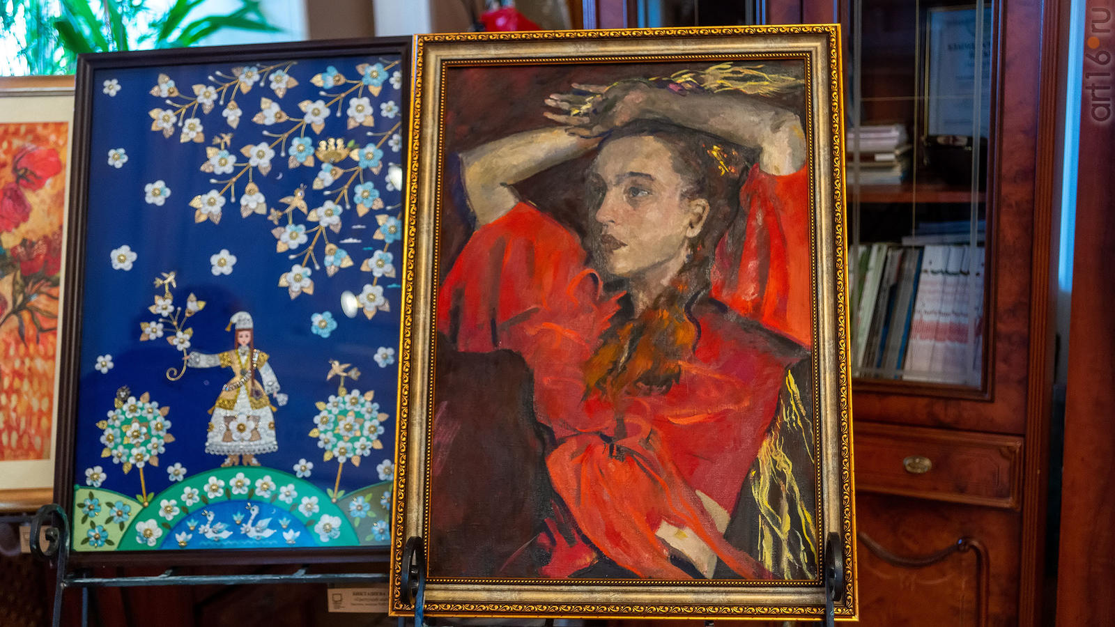 Фото №975962. Фрагмент экспозиции выставки СХ РТ «50 женских ликов»Цветочная рапсодия. Исанбет Л. /Вечер на набережной. 2019. Бакирв И. /Портрет в красной шляпе. Равилова Р.