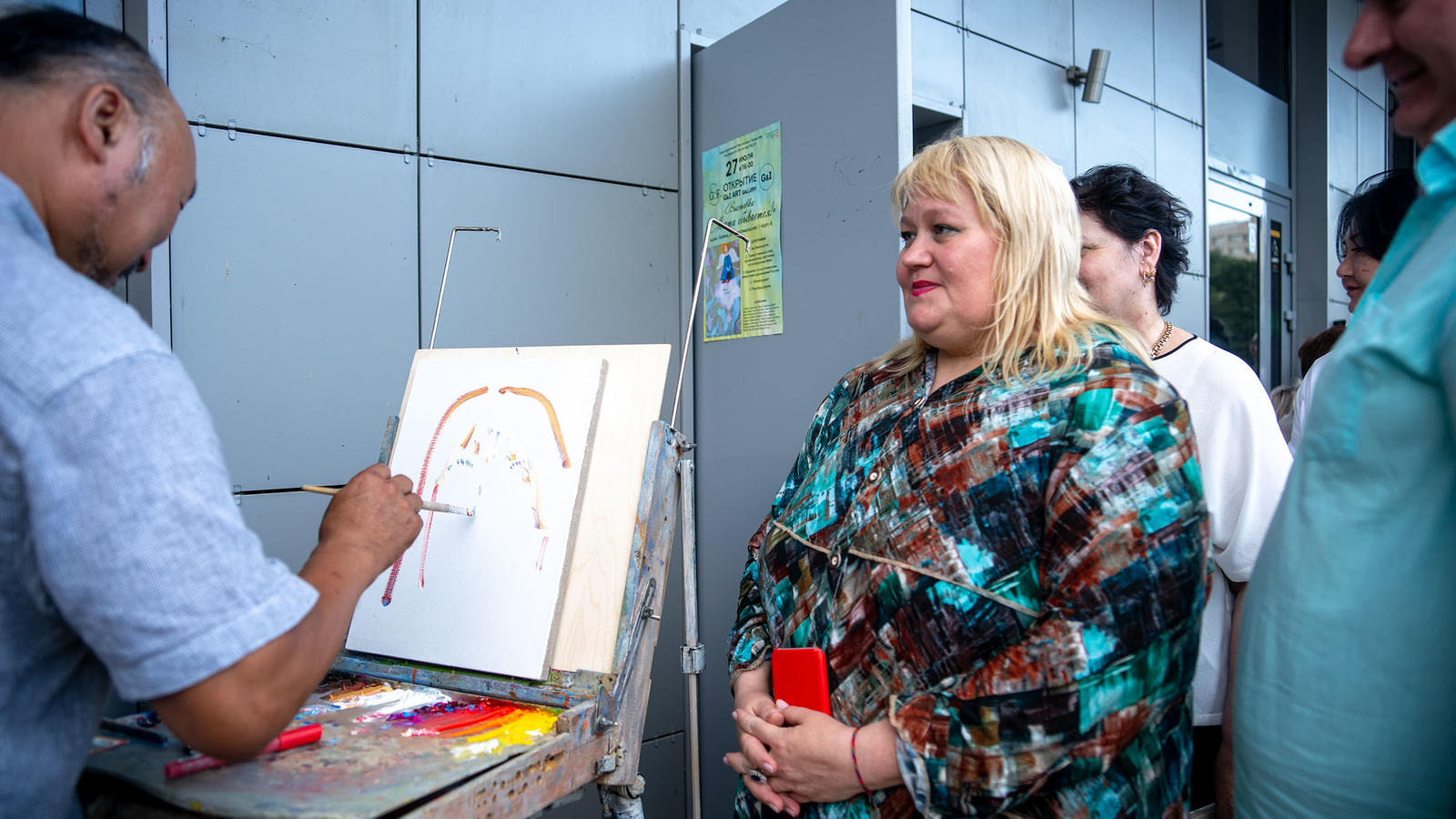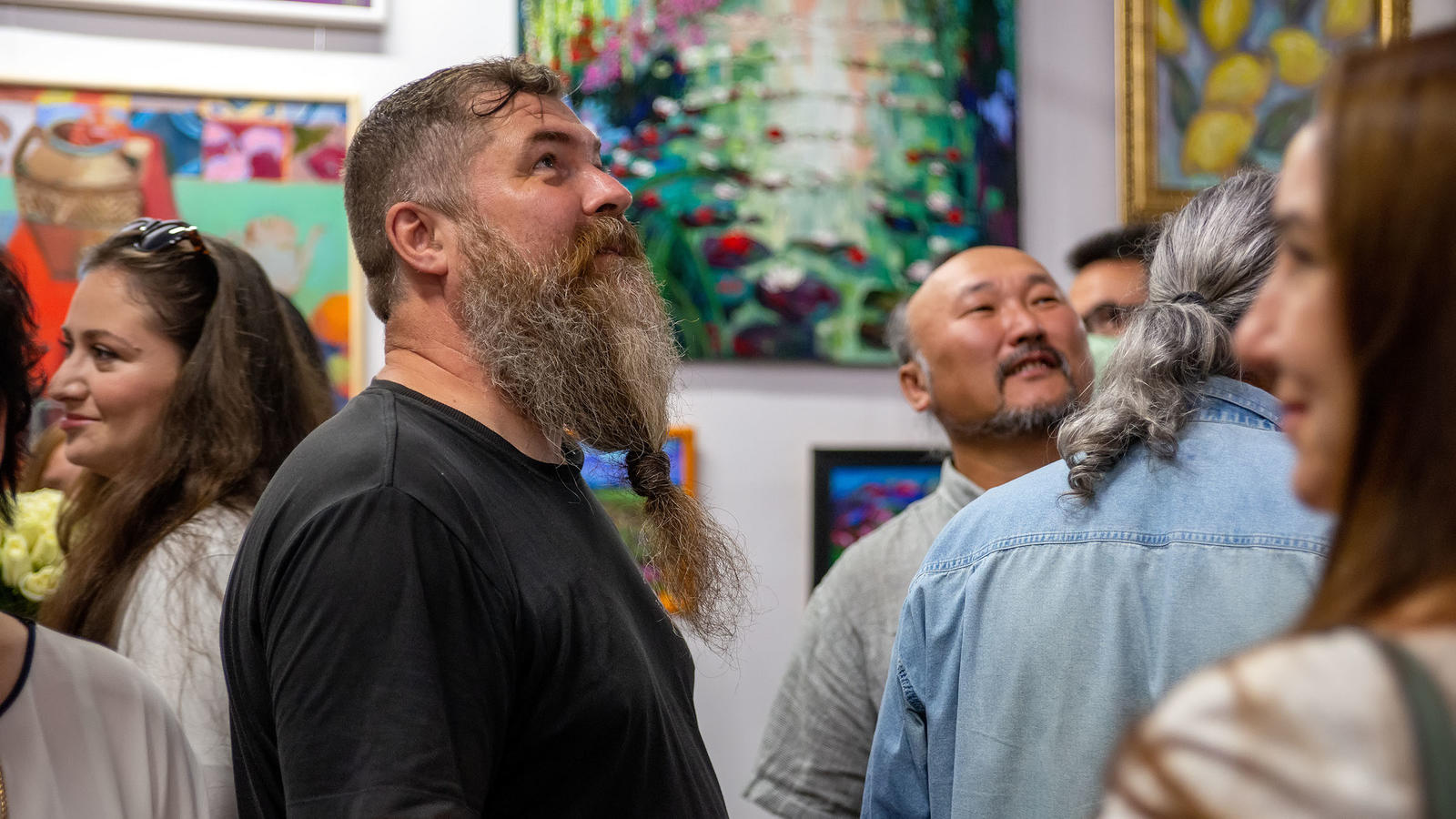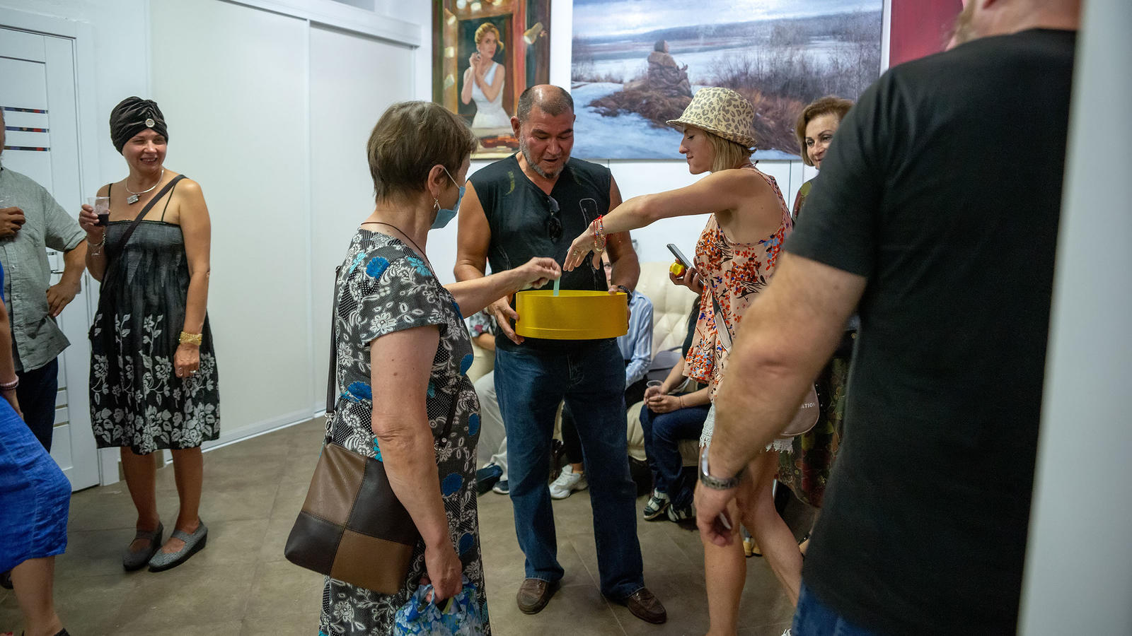 Фото №978947. Art16.ru Photo archiveДружеское общение художников, искусствоведов и зрителей плавно перетекло в церемонию открытия. Затем последовал фуршет и розыгрыш призов по номеру пригласительного билета. Везунчики с «нужным №» получили в подарок картины участников выставки. И на «десерт» — мастер-класс Бато.
