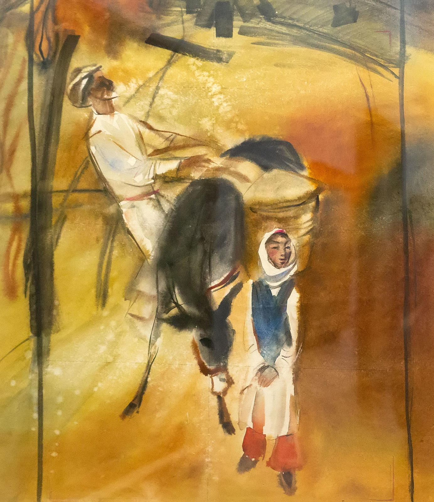 Для Расиха Ахметвалиева основная тема творчества — всадники. На выставке представлена тремя яркими картинами-панно.