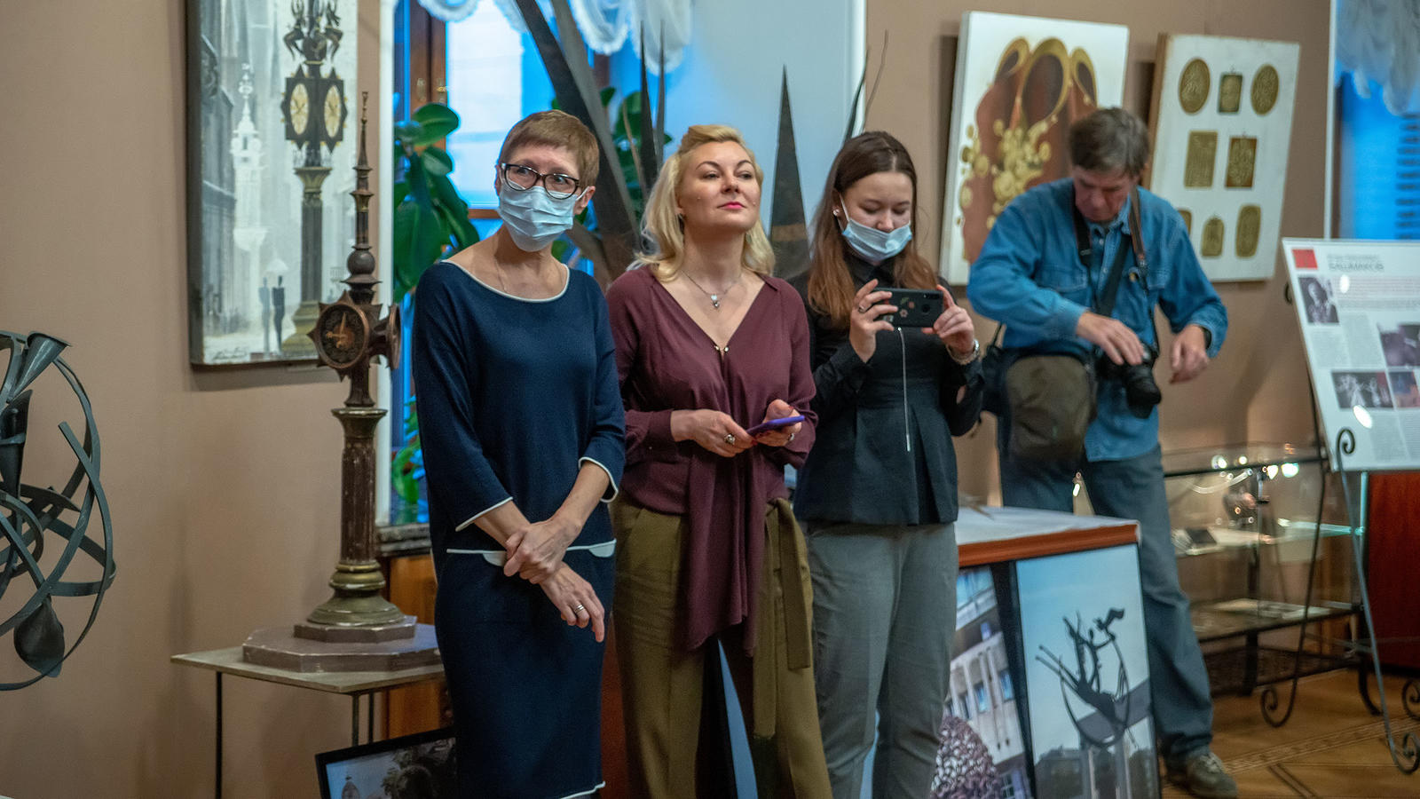 Фото №980989. На открытии «Выставка 6 молодых художников. Взгляд через 50 лет»Имена художников экспонентов выставки: Надира Альмеева, Игоря Башмакова, Евгения Голубцова, Георгия Иванова, Владимира Нестеренко, Рустема Фаттахова - широко известны в Татарстане и за его пределами. Каждый из них занял свою нишу в искусстве и художественной жизни страны. Надир Альмеев, мастер книжной и станковой графики. Игорь Башмаков — художник по металлу. Его скульптуры, объемно-пространственные композиции знакомы жителям Казани и гостям республики: часы на кольце, "Кот Казанский", фонтан "Су Анасы" и др.). Евгений Голубцов и Владимир Нестеренко — весьма интересные художники и проектировщики интерьеров. В 1970-80 г дизайнерское бюро "Группа 17" под руководством Евгения Голубцова осуществило ряд целый ряд работ по оформлению интерьеров общественных зданий в Татарстане, Елабуге - Дом музей И.И.Шишкина, В Казани — пивной бар Бегемот, ресторан "Казань", клуб "Маяковский", "Желтая кофта" и др. Рустем Фаттахов проявлял свои художественные таланты, работая на казанской телестудии. Георгий Иванов, художник-проектировщик, монументалист, график, художник театрально-декорационного искусства.