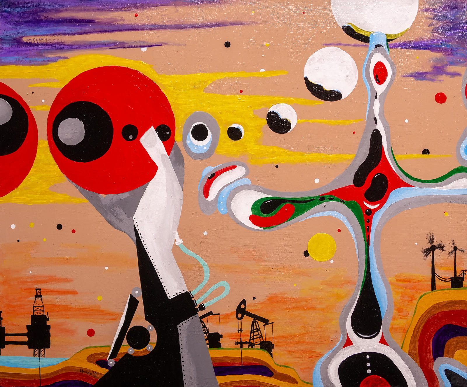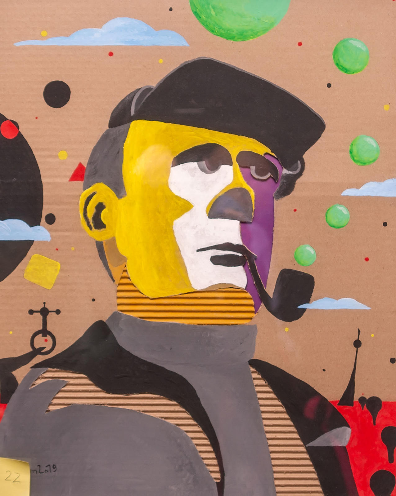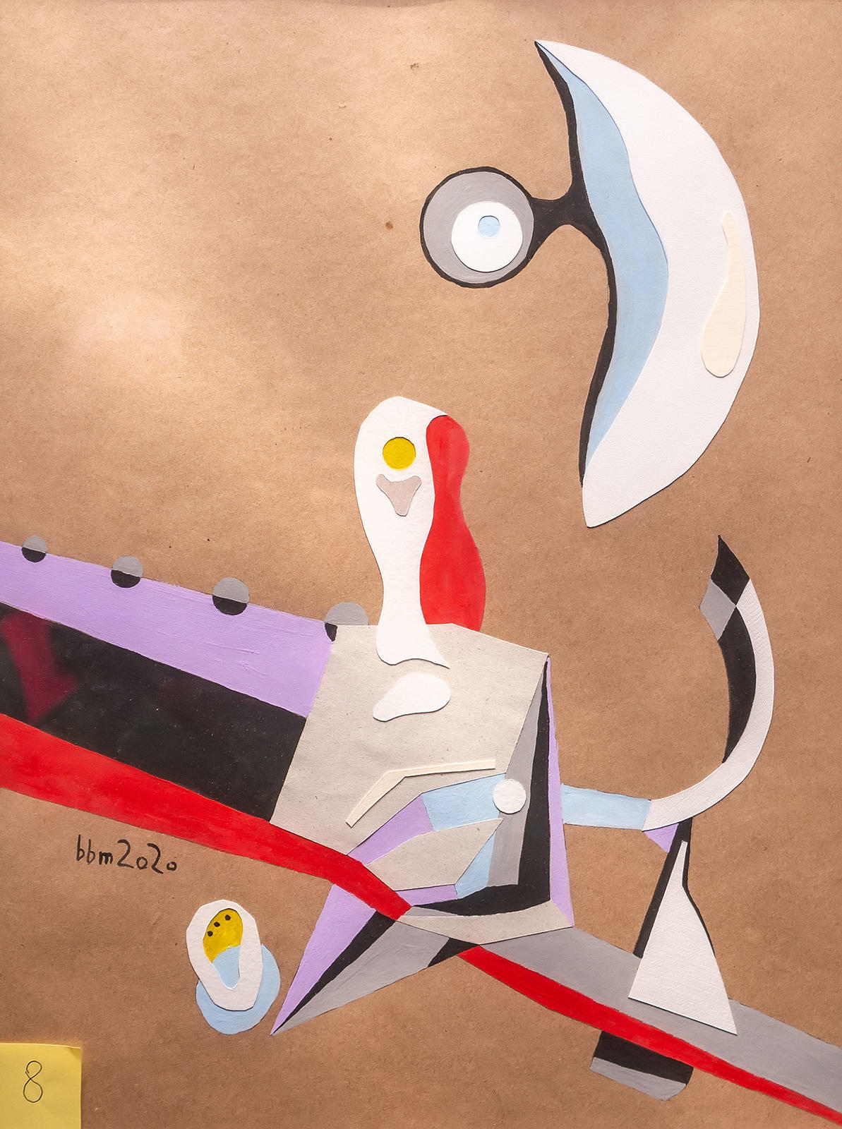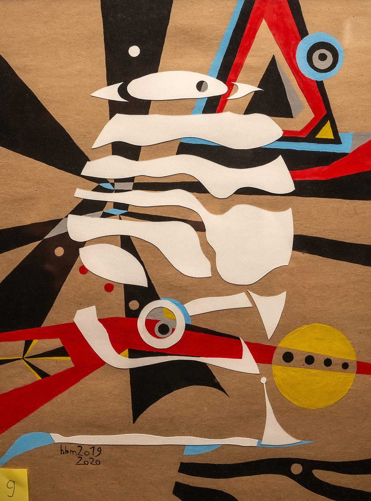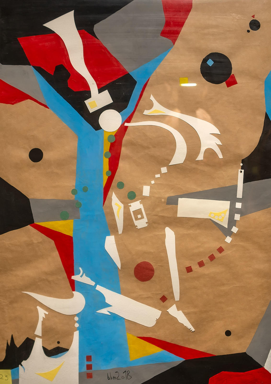 — Самое сложное было соединить различные элементы. В что можно соединять в живописи? Там же одна краска. Как организовать систему из красочных элементов? А лучше не одну систему, а, скажем, две. А так как у меня подход к искусству материальный, то решил я сочетать фактуру различной бумаги и цвета. Чтоб цвет стал элементом, я начал закрашивать формы в открытые цвета, которые не имеют дополнений, ни имеют глубины. Так же открытый цвет помогал «организовать» взаимодействие элементов, а это было важным. Чтобы было не очень пестро, я ограничился несколькими цветами, — рассказывает Владимир, и продолжает — первое, с чем я столкнулся — это организация двух различных систем в одной работе. Мой мозг не мог это вынести. Я перешел к синтезу. Синтез принес результат. Взаимодействие элементов перешло к появлению объема, точнее псевдообъема или иллюзии объема, а потом и к построению псевдопространства. Все это строилось как сочетание форм и цвета. Потом стали появляться разные структуры. Структуры вырастали в миры, а потом мир стал текучим... Ценность моих художественно-экспериментальных практик в том, что происходит постижение себя и мира. Я вживаюсь в мир и мир отвечает мне. Я узнаю его строение и структуры.