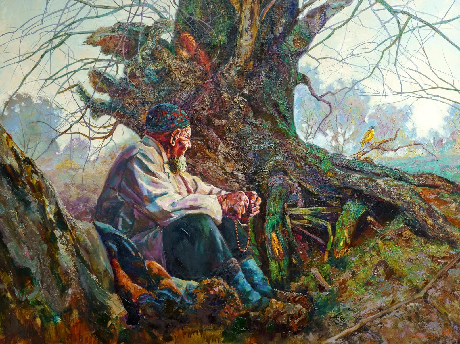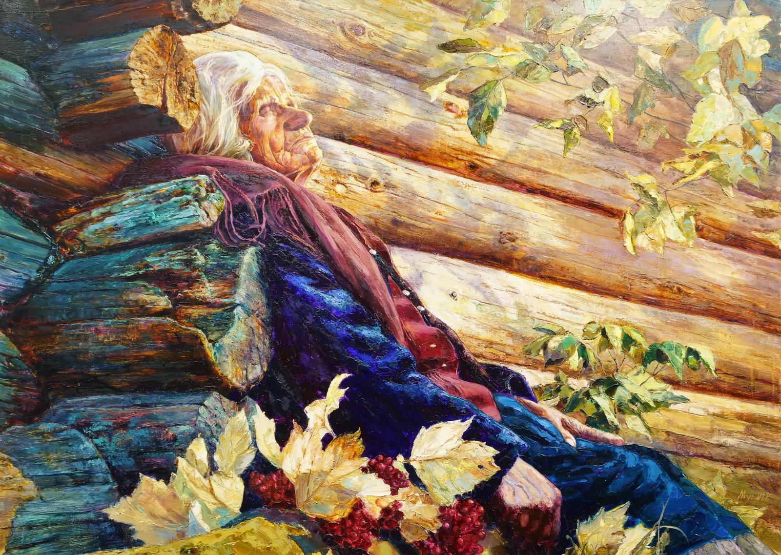 — Картина «Полдень» — авторский повтор. На картине женщина, с которой мы дружили много лет. Она жила в старой избе. Я приходил к ней много раз. А она рассказывала и рассказывала: про свою тяжелую жизнь, судьбу, про все то, что выпало на её долю. Повествуя обо всем этом, она раскрывалась передо мной, а я все больше и больше очаровывался ею. Какие у нее чистые глаза! Какой взгляд! Я был поражен тем, через что она прошла и удивлялся, как она сохранила доброе отношение к жизни и людям. Откуда бралось её внутреннее желание дарить, давать свое добро, свое тепло? Эта женщина на маленькую пенсию зимой покупала конфеты, собирала их в пакеты, а летом, когда приезжали гости из города, раздавала их детям. Я решил ее обязательно запечатлеть. Успел... Она уже ушла из жизни. Звали её Закия апа.