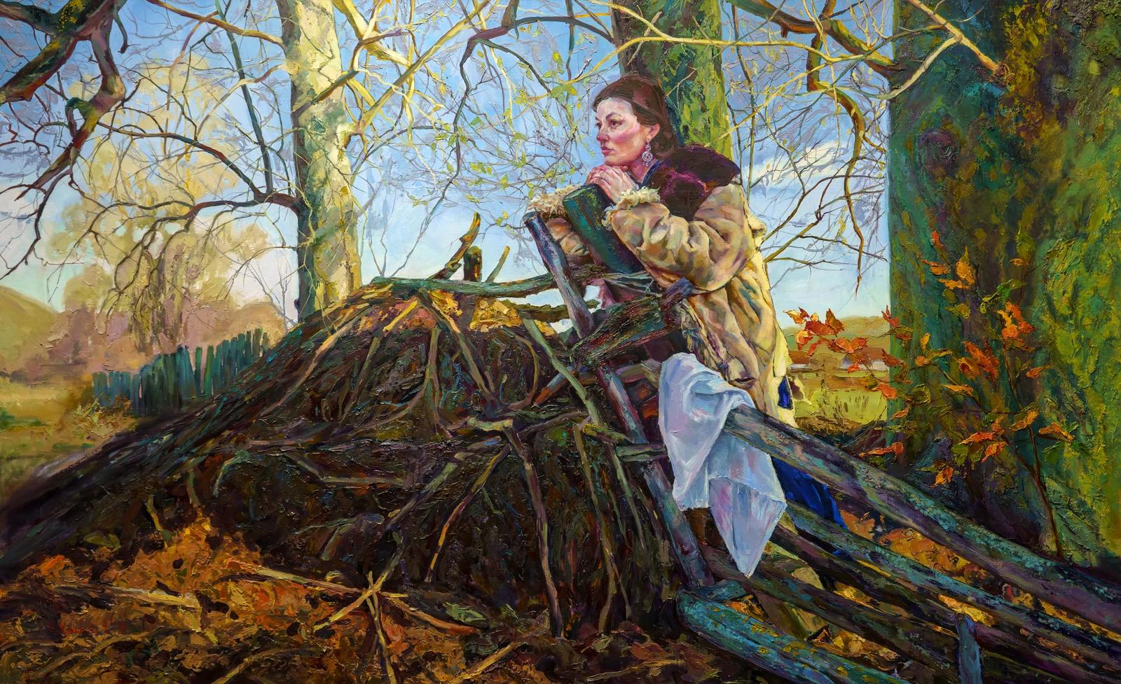 Это история ожидания девушки, которая о чем-то мечтает. В ее позе, в скинутом платке, какая-то вольность мысли.