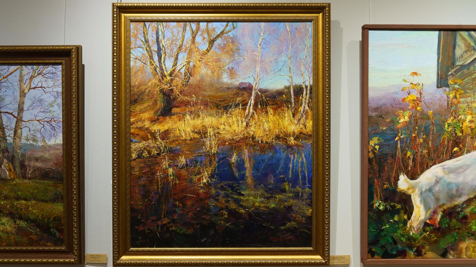 Стоя у одной из понравившихся мне работ, Лана поведала предысторию её написания. Однажды осенью она приехала к сестре в Лаишево и они пошли гулять. Сестра была в недоумении, что можно красивого разглядеть в такую пору: пасмурно, да сухие ветки. И тут солнце. Вечернее яркое солнышко так озарило лужу, возле которой проходили сестры. Лужа была очень живописная. «Свет зари вечерней» Лана Мусина--Медвецкая написана на следующий день по приезду из Лаишево. С Ириком натянули холст, и Лана на эмоциях начала писать, пока картинка была свежа в памяти. «Потом, возможно, я бы испугалась писать так ярко, звонко» — уточнила Лана. Картина получилась очень "вкусная", сочная, колоритная.