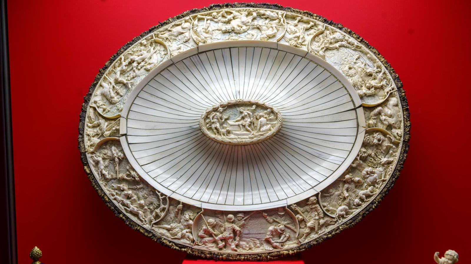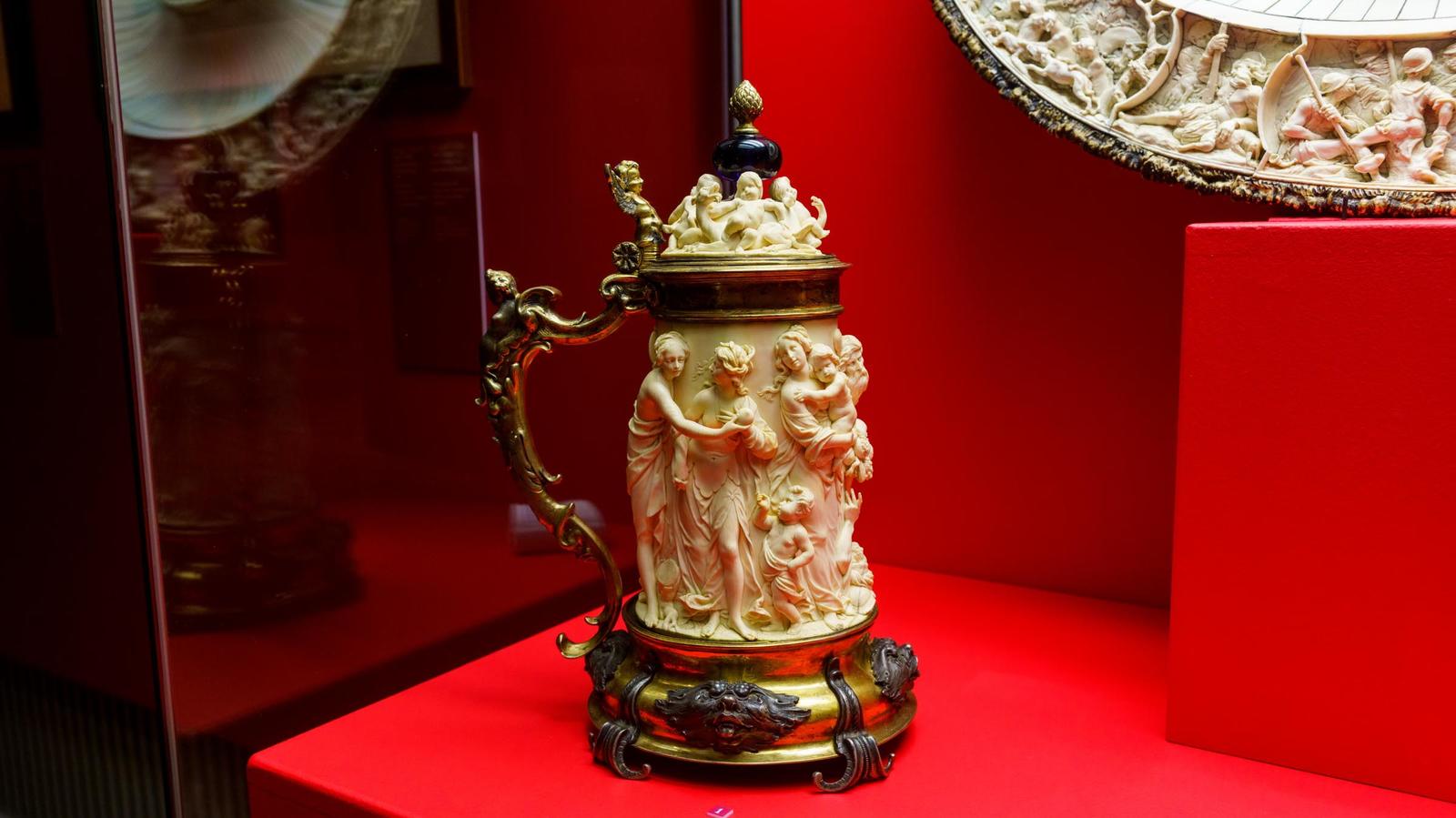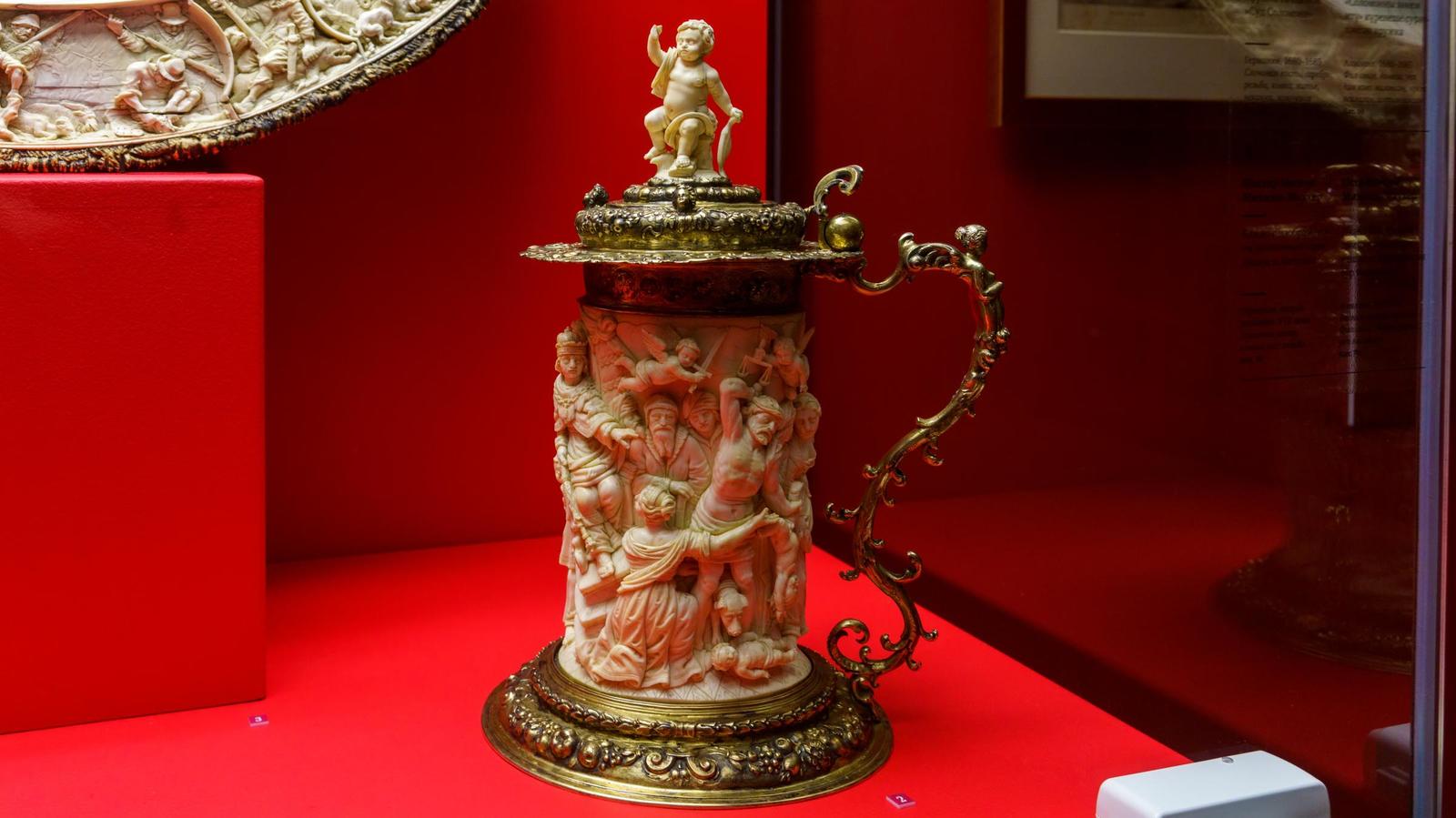 Слоновая кость, серебро, синее стекло, резьба, ковка, литье, чеканка, золочение. Высотк: 38.5 см. Клейма на оправе: города Аугсбурга и мастера Андреаса I Виккертаа (AW; 1600-1661, Rossenberg1922. Nr.540 b). Поступление: до 1859, Инв. №Э-7285