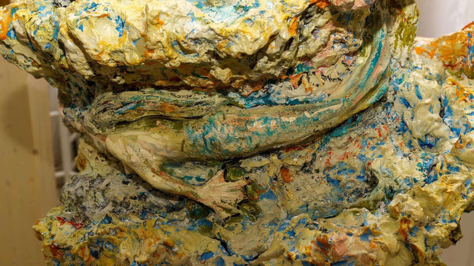 Фото №1000590. Арт-объект для загадывания желаний. Адель ХалиуллинС малых лет сын художника Рамиля Халиуллина, Адель, был знаком с творчеством Баки Урманче. Для него Баки Идрисович — «гений»" и «путеводная звезда» в творчестве. Если присмотреться к фигуре старца, то кажется, что аксакал, рассказывающий сказки в проекте А. Халиуллина и есть сам Баки Урманче. Борода аксакала, подобно реке, которая бурным течением выхватывает из истории татарского народа, те или иные сюжеты народных сказок, представляет нам знакомых с детства героев. В скульптуру надо вглядываться: там Сак и Сок, Шурале, Алтынчеч, русалка и Водяная...