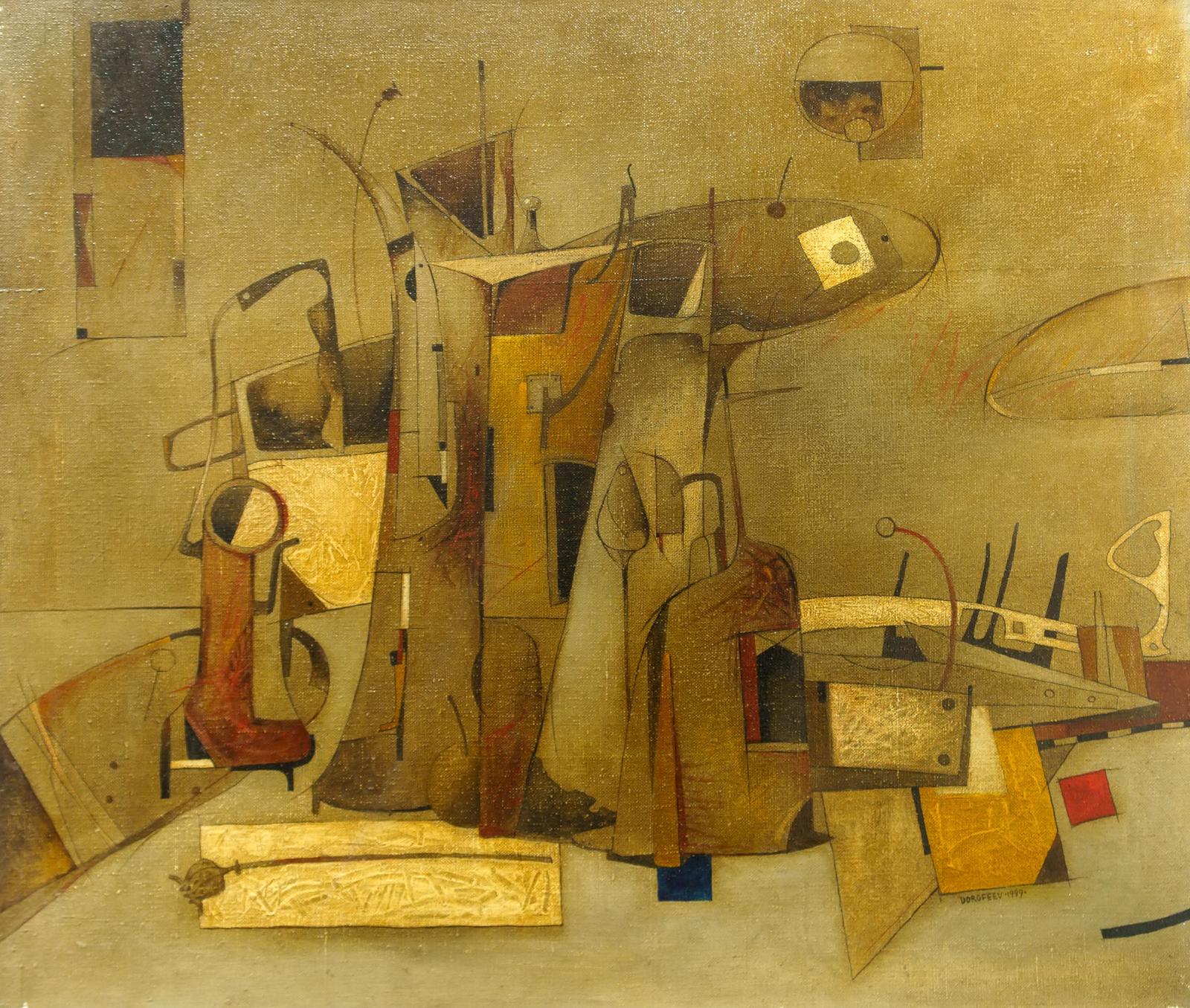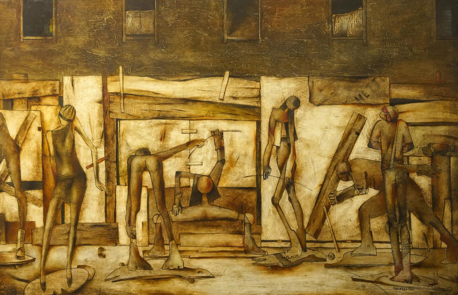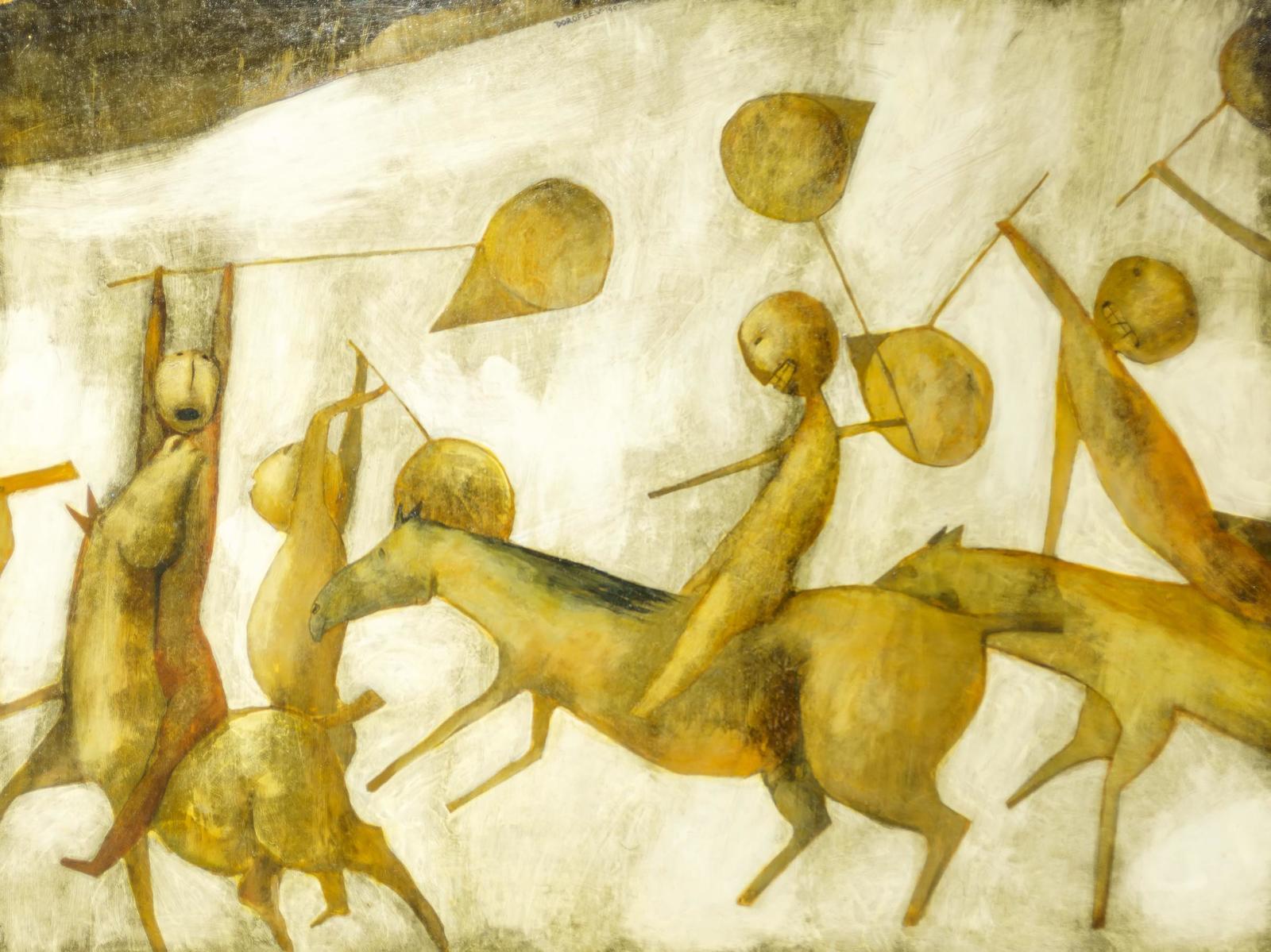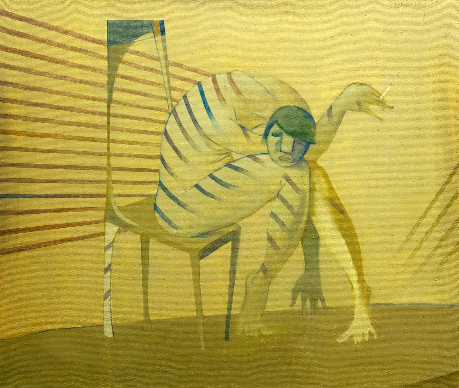 Работа №20 «Точка зрения». Вглядитесь, как устойчиво "стоит" фигурка мужчины всё в том же одеянии, в обозначенной художником плоскости. Сдержанные тона при мощном звучании.