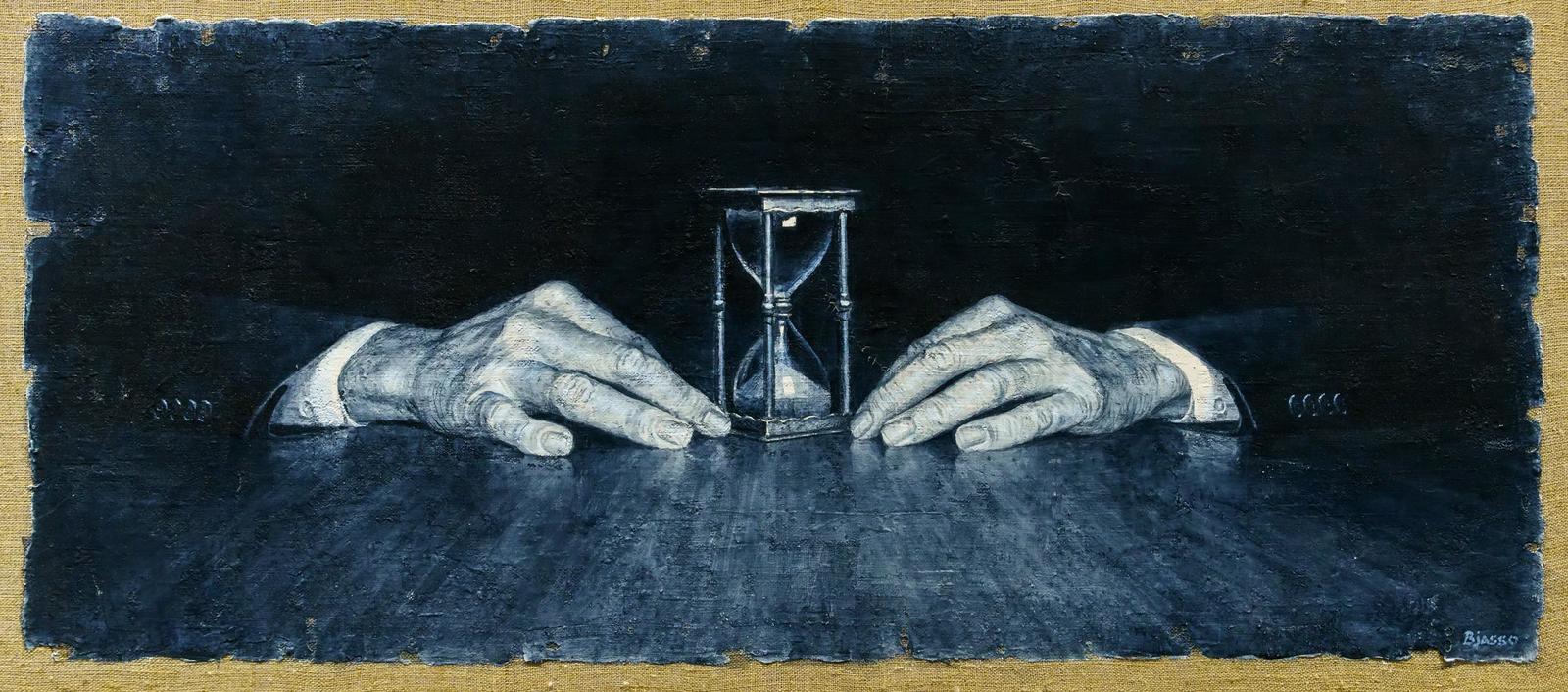 Здесь совершенно другая энергетика. Картина, связывающая экспозицию двух этажей сразу не замечаю. Песочные часы извещают о близком конце: «Ваше время закончилось». Преуспел ты в жизни или нет, конец — один.