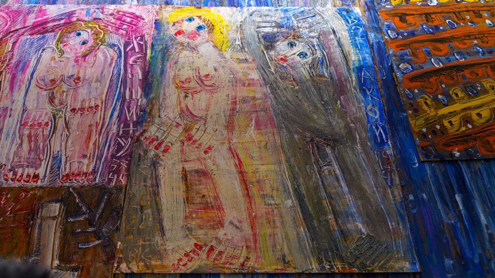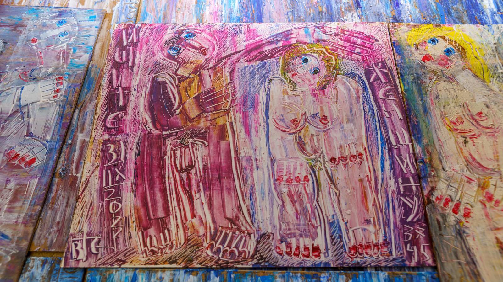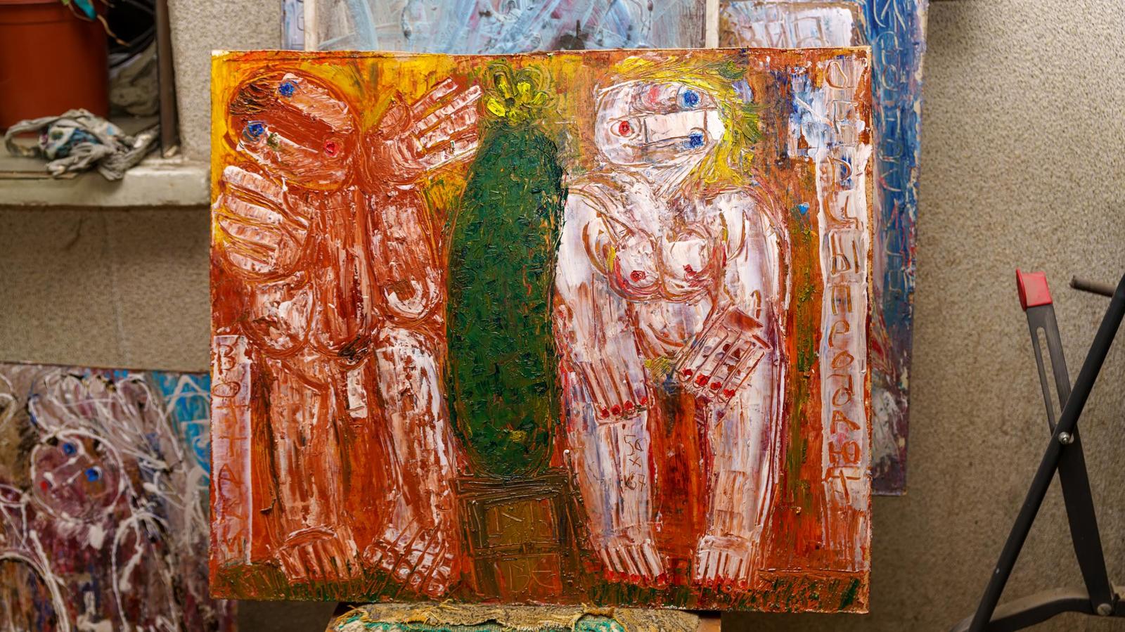 Фото №1004575. Положение во гроб. Виктор ТимофеевВ 2010 году случилось несчастье. Произошел пожар в доме, где жил художник. Было уничтожено все имущество и все ранние работы. Это послужило сигналом для Виктора. С тех пор он работает больше. Ни дня без картины. Пишет одну или две в день, больше себе не позволяет — хранить будет негде. Пишет на разные темы. Его творчество необъятно по содержанию. Кажется, он пишет обо всем. В творчестве Виктора Тимофеева много "литератущины" (с его слов). Виктор любит поэзию. Много читает наизусть. В списке его излюбленных мастеров Осип Мандельштам, Борис Пастернак, Велимир Хлебников, Анна Ахматова... Их стихи находят отклик в душе. Пропуская прочитанное через себя, художник выплескивает эмоции на оргалите, картоне, бумаге. Иногда, поводом для написания становится праздник. Пришел в мастерскую, а нынче праздник, его он и напишет. Работает художник в технике alla prima — «в один присест». Если пишет маслом, то чаще мастихином по твердой поверхности. Если занимается графикой — то карандашами, линерами, фломастерами. Работы по-театральному декоративны.