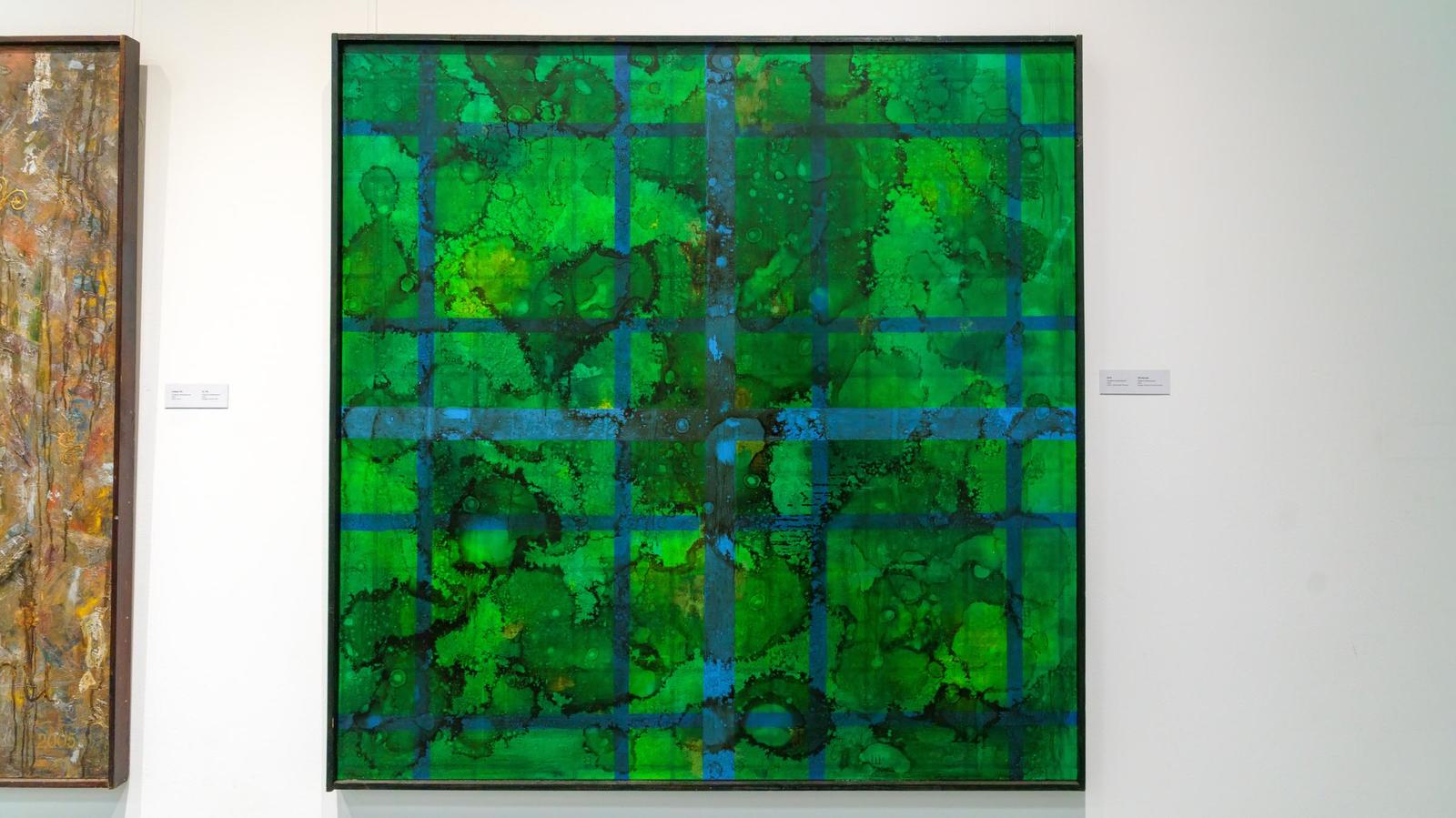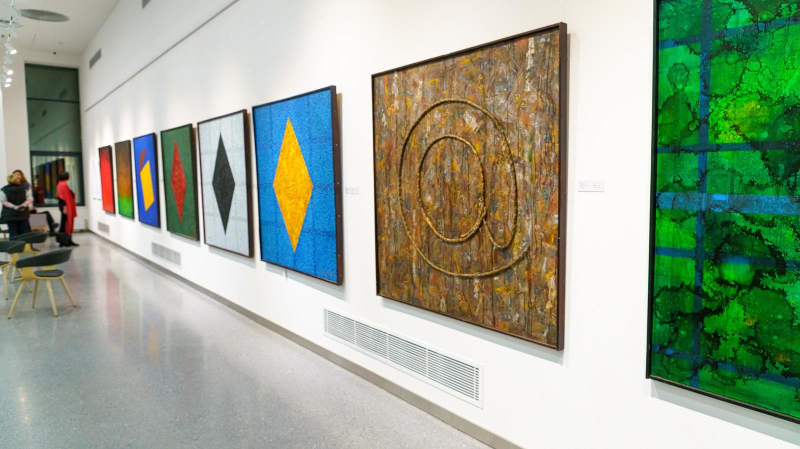 Фото №1004760. Фрагмент экспозиции выставки А.Шаймарданова «Тёмная сторона луны»«Тёмная сторона Луны» — так по-русски звучит название легендарного альбома «The Dark Side of The Moon» (1973-74 гг) группы Pink Floyd. В альбоме группы произведения «объединены единой, связующей идеей давления современного мира на психику человека». В экспозиции выставки Альфрида Шаймарданова представлены "сюжеты" (явления), которые он, человек нашей эпохи, пропускает через себя и выплескивает на холст в форме беспредметной живописи. Что-то цепляет художника, он рефлексирует, своим творчеством реагирует на внешнее раздражение.