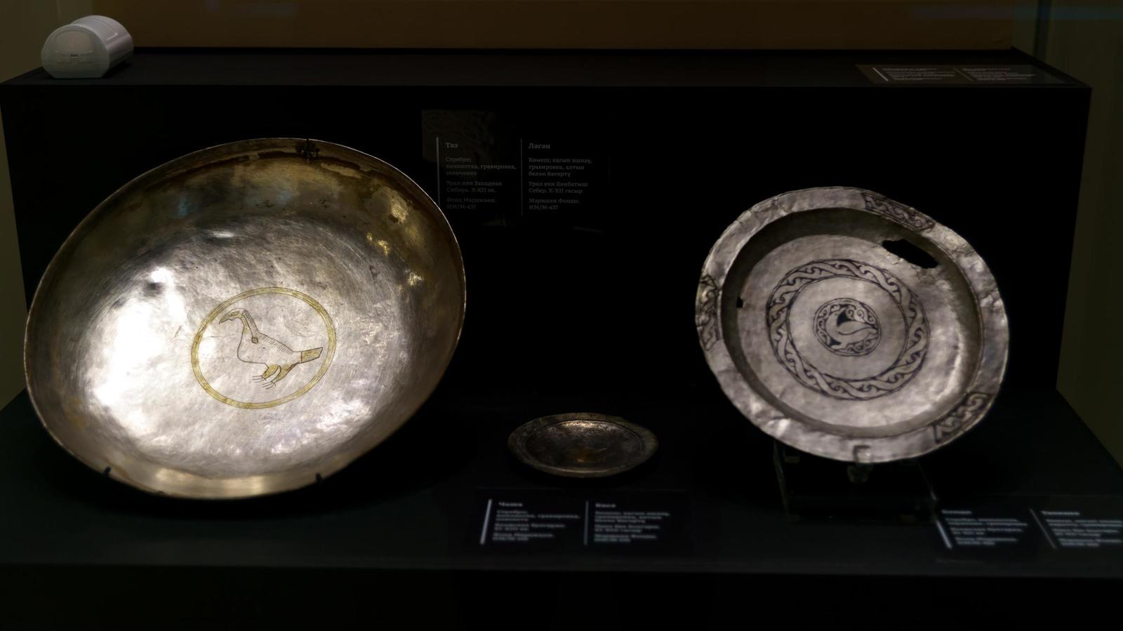 Фото №1005681. Фрагмент экспозиции выставки «Серебро за меха»Выставку открыли: министр культуры Республики Татарстан Ирада Аюпова, президент Фонда Марджани Рустам Сулейманов, куратор выставки ведущий научный сотрудник Отдела Востока Государственного Эрмитажа Асан Толгаев, директор Музея-заповедника «Казанский Кремль» Ильнур Рахимов.