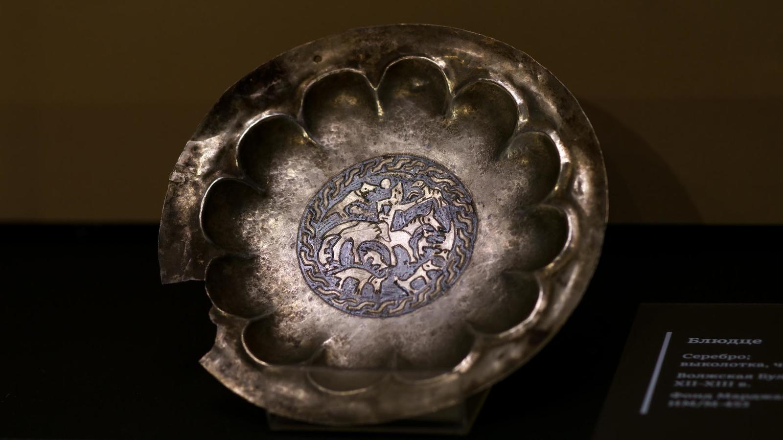 Фото №1005726. Блюдо. Средняя Азия (Согд), VIII в.— первая пол. IX вв.Серебро; литье, гравировка, аппликация, чернение, пайка;