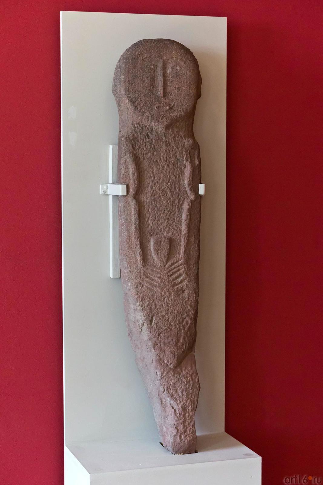 „Каменные бабы“ — так называют половецкие изваяния даже если они изображают мужчину — являются ценным источником для изучения внешнего вида и одежды кочевников южнорусских степей. Они воздвигались отдельно от могилы на возвышенностях или вершинах древних курганов и посвящались умершим предкам-героям. Статуи служили для жертвоприношения. Эта статуя была найдена И. В. Аничковым в 1896 году в Туркестане».