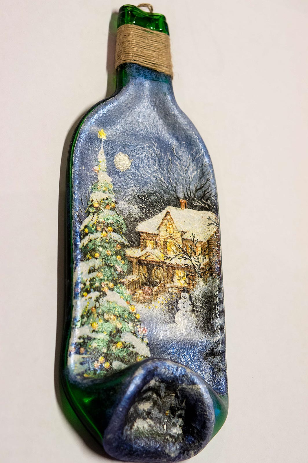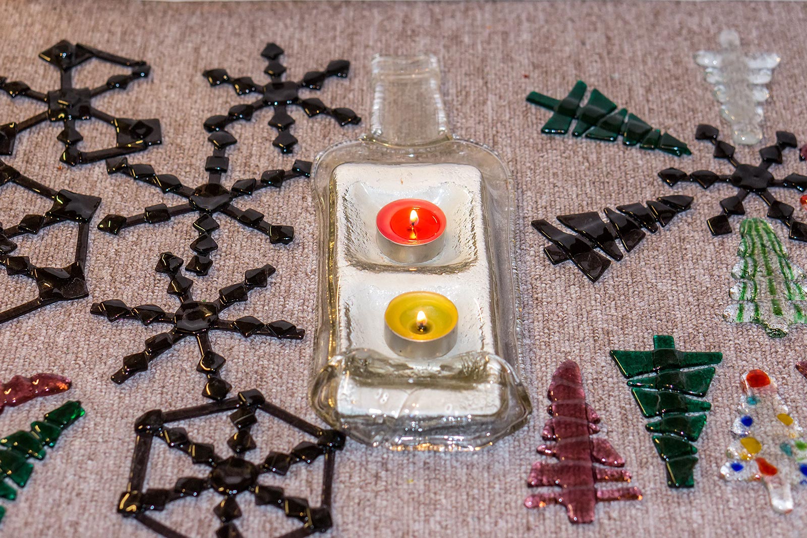 — Для изготовления стеклянных украшений, декорированных панно, витражей и пр. мы используем специальное цветное фьюзинговое стекло. Но в ассортименте нашей продукции встречаются декорированные сфьюзенные бутылки — это когда из обычной стеклотары синтезом фьюзинга и декупажа получают великолепное художественное изделие.