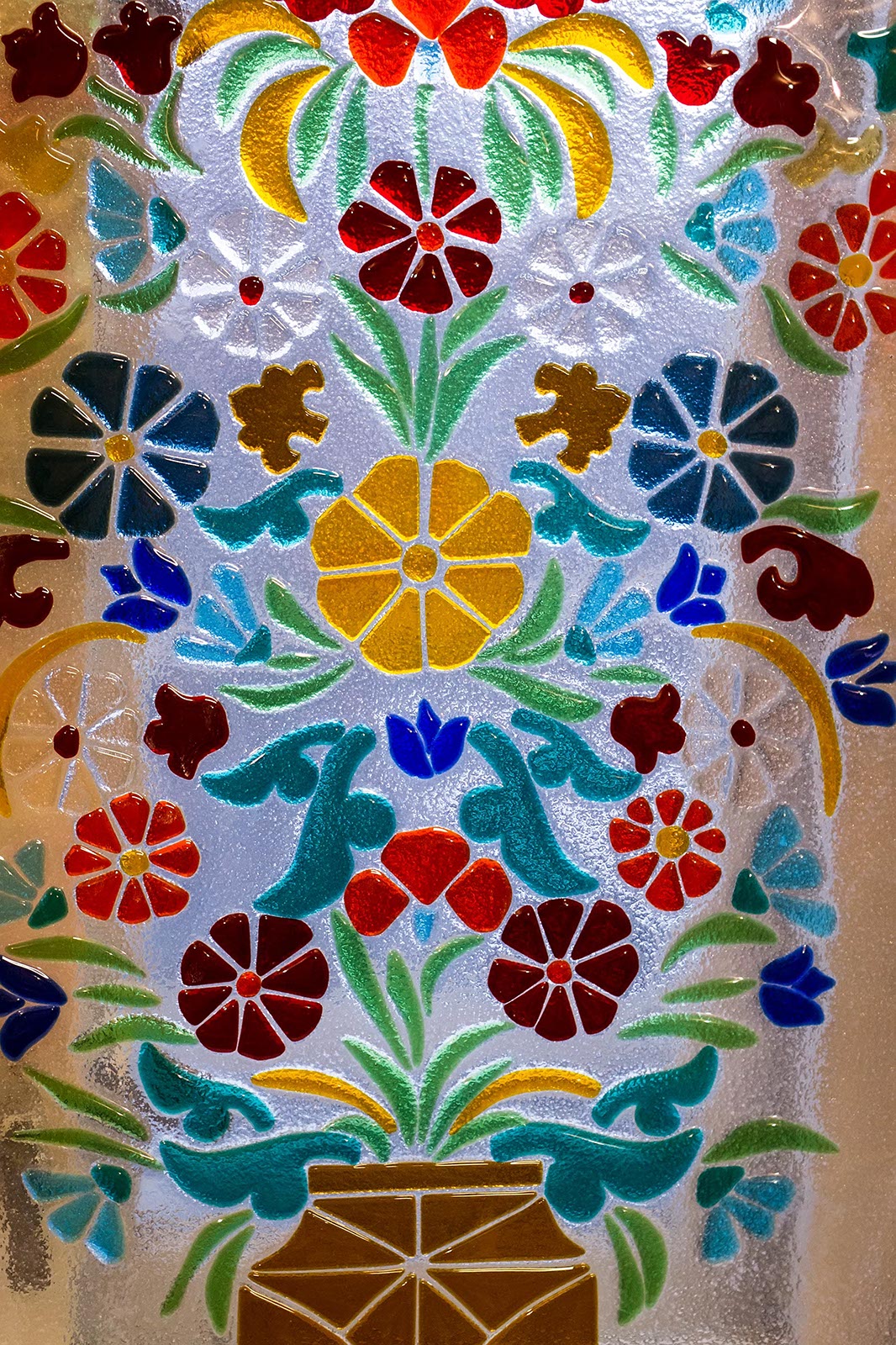Во времена Советского Союза витражи исполнялись мастерами в технике Тиффани. Стекло вырезалось под определенный орнамент, композицию, соединялось медной полосой и пайкой.