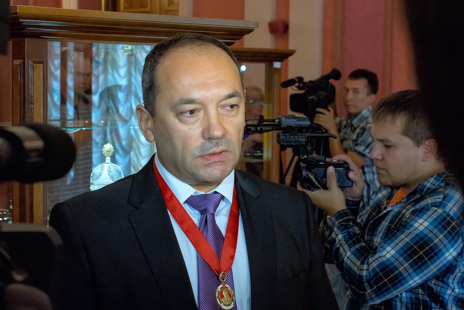 Фото №172992. Art16.ru Photo archiveРуслан Качановский подробно рассказал о привезенных экспонатах. Из его рассказа стало известно, что президентский юбилейный подарок украшают 2859 бриллиантов высоких характеристик, 690 индийских сапфиров, 35 изумрудов, 19 рубинов.