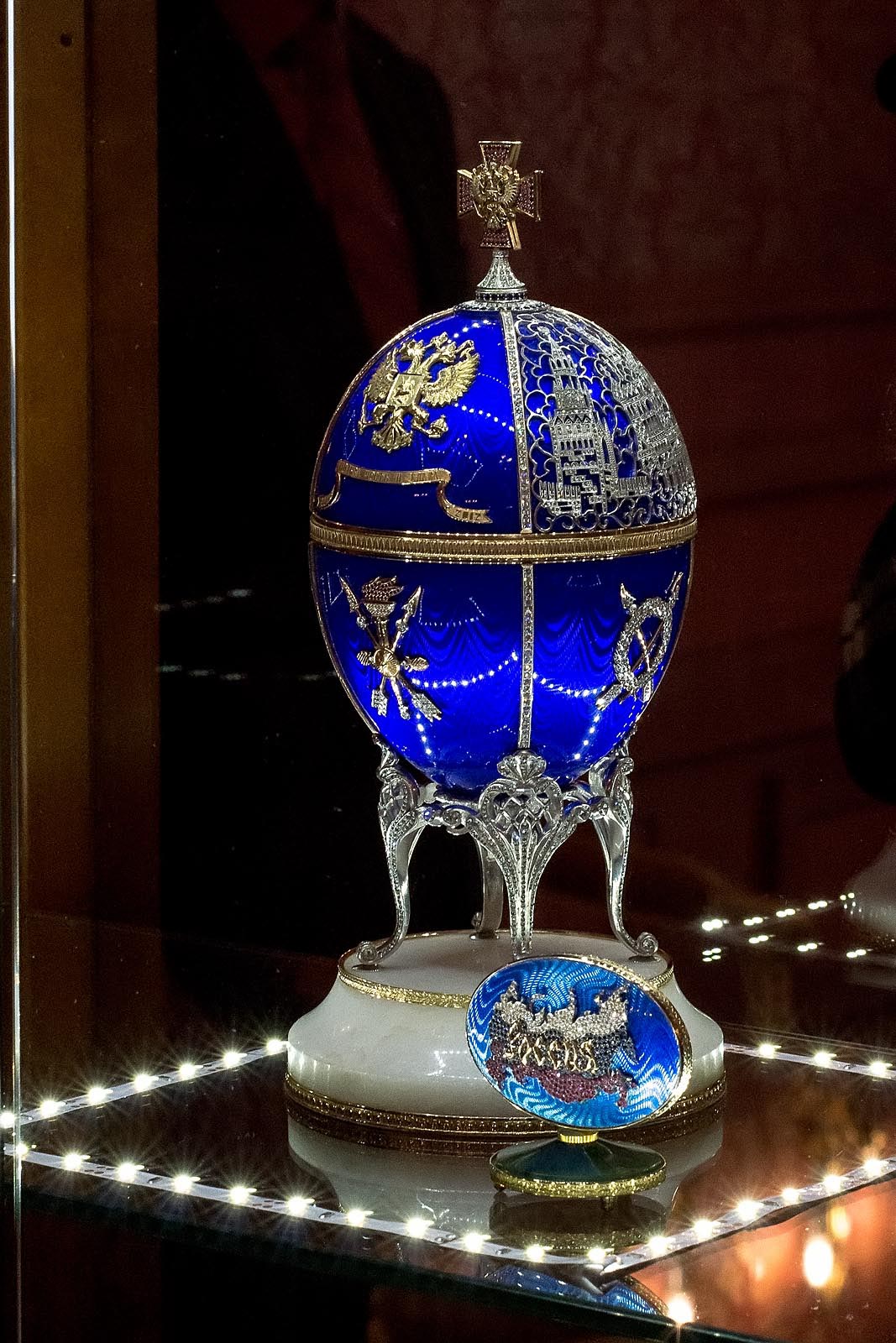 Фото №173004. Art16.ru Photo archive Большое пасхальное яйцо, посвященное институту президентства России выполнено в технике К.Фаберже, на это указывает узнаваемый стиль, эмаль, сочетание металлов и камней. В верхней части яйца расположен высший орден президента «За заслуги перед отечеством I степени», которым он награждается когда приступает к обязанностям. На ленточке начертан девиз президента «Честь, польза, слава». Также на яйце изображены значимые места Москвы: Кремль, Спасская башня, храм Христа Спасителя.