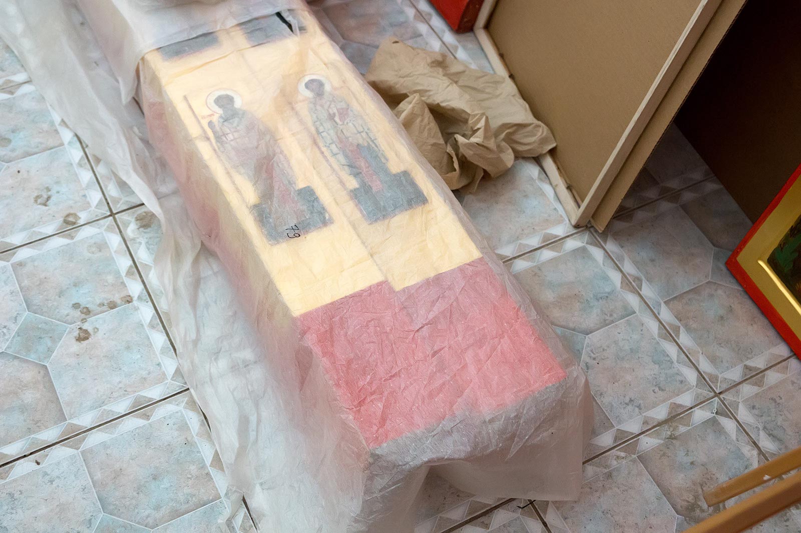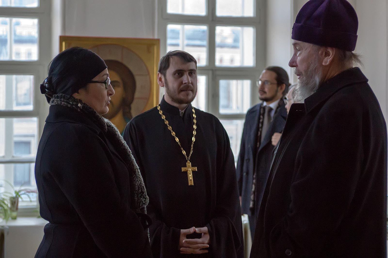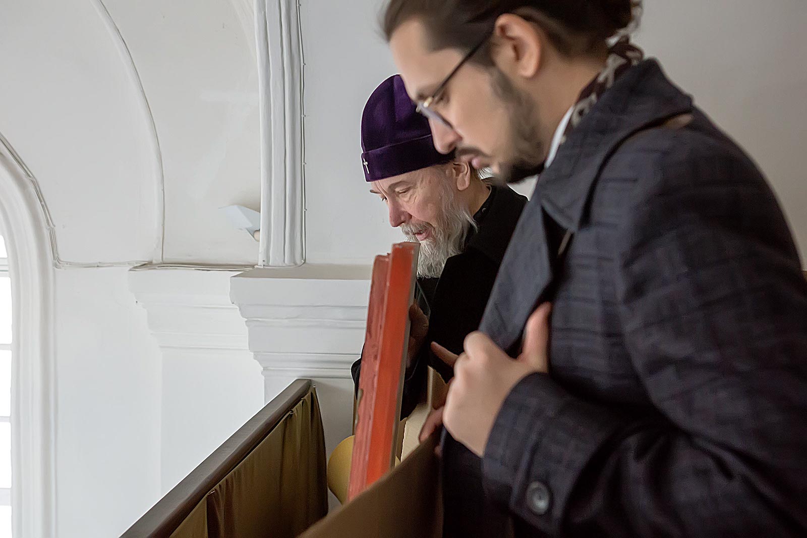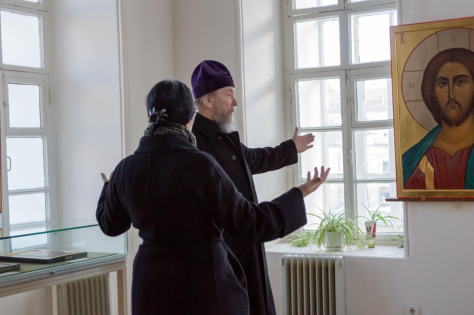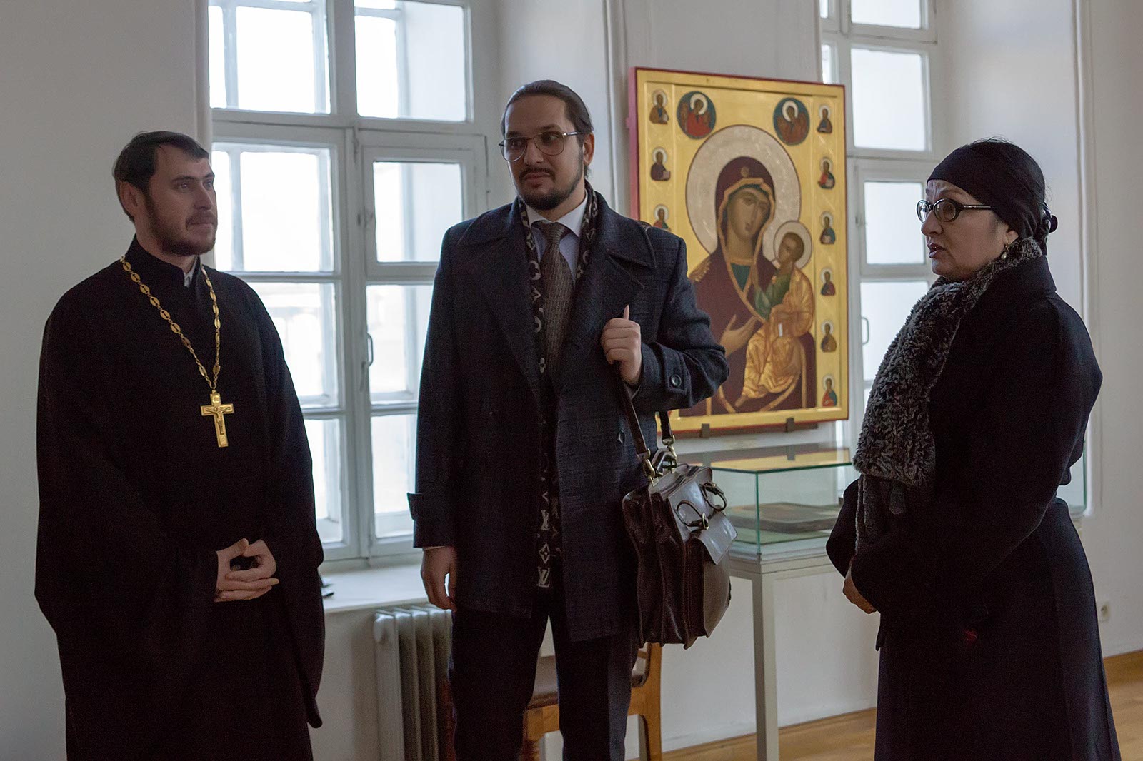Фото №42891. На выставке икон в колокольне Богоявленской церквиЧерез неделю, 26 ноября 2013 года, разговор продолжился уже в Колокольне Богоявленского собора. Митрополит Казанский и Татарстанский Анастасий и Розалия Нургалеева в ходе переговоров договорились о том, что выставочная деятельность музея на данной площадке будет продолжена, в Колокольне совместными усилиями установят иконостас, и там будут проводиться богослужения.