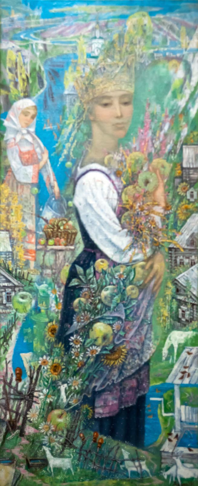 Фото №272612. Весна священная. Автор: Виталий СкобеевНа полотне «Любовь и Надежда» тоже изображены девушки, но и они не конкретные, а больше аллегория. Девушки наряжены в простые русские сарафаны, кокошники, платочки. За их спиной деревенька, ритмически переходящая в пейзаж, землю. Все связано — рассказывает Виталий.