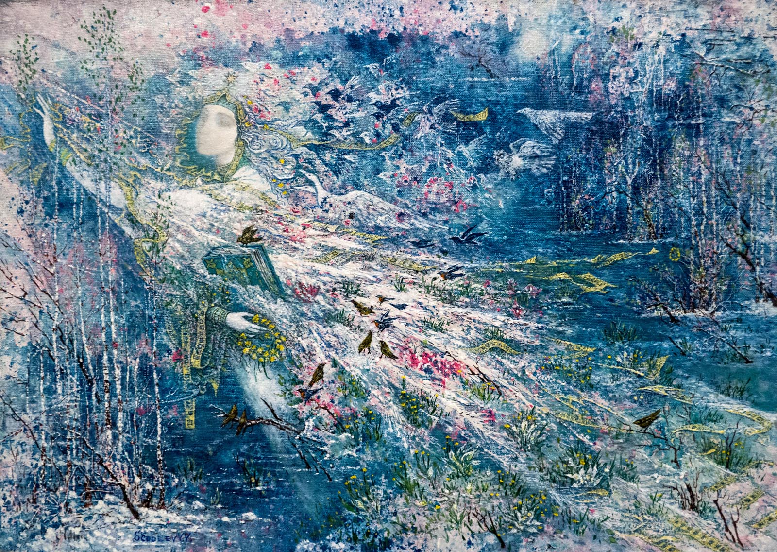 «Весна священная» — аллегория женщины. Она собирает силы весенние, животворящую силу. Может быть, она покровительница Земли, земного начала? В тоже время в образе соединено земное и небесное. У девушки в руках книга. Это книга жизни, на обложке просматривается восьмиконечная звезда.