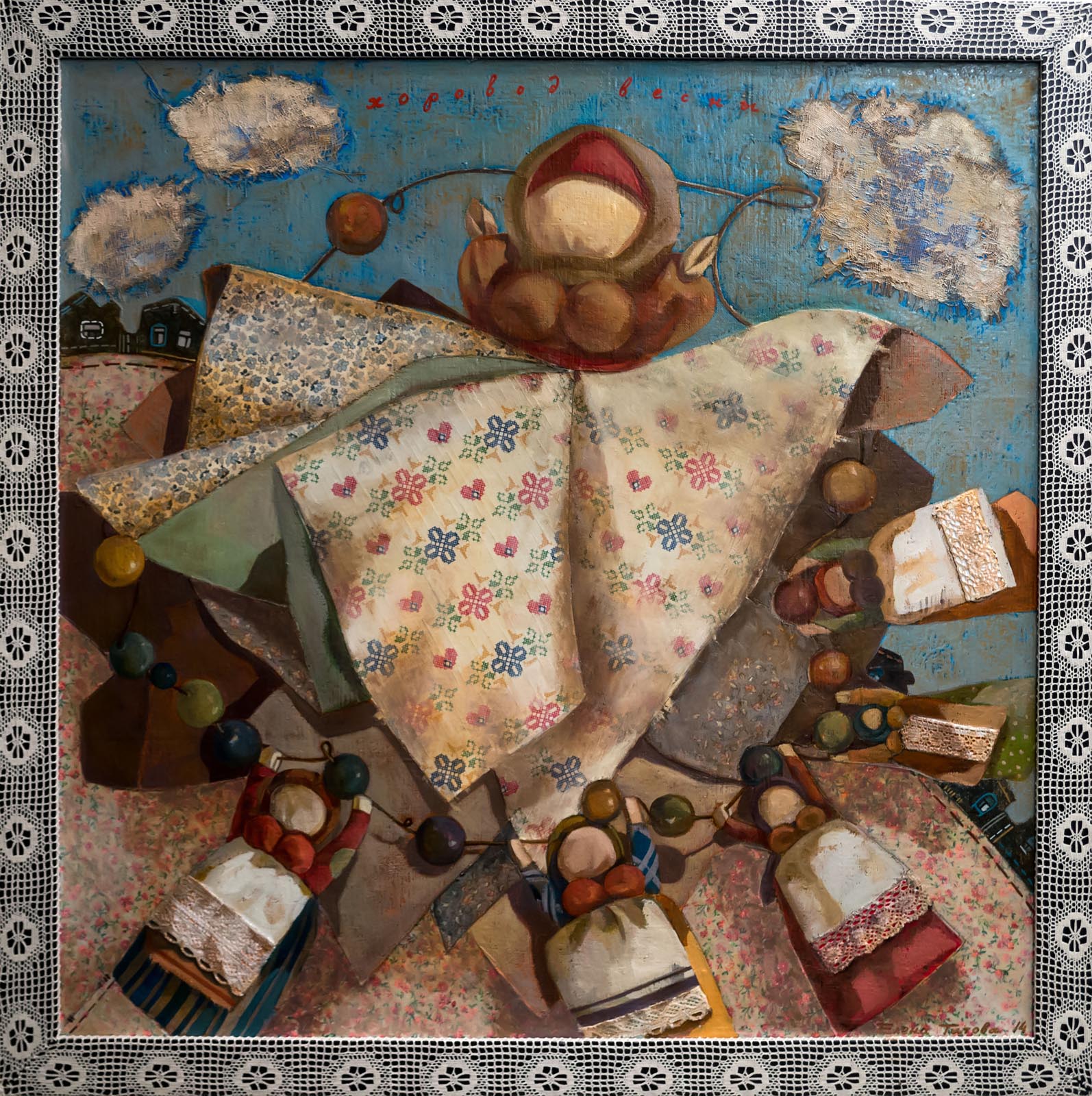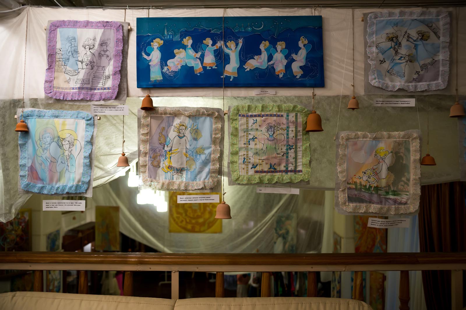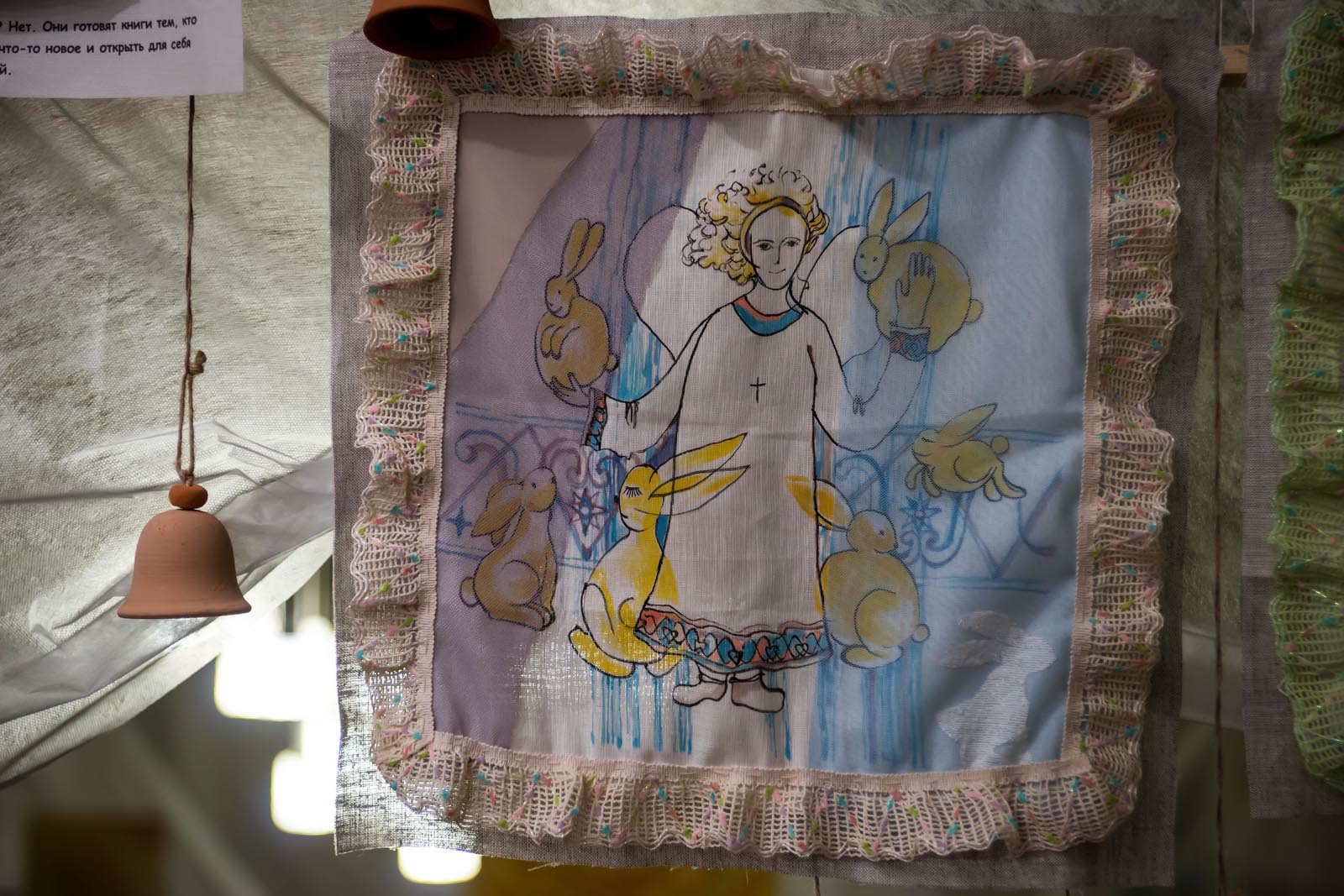 Фото №272726. Art16.ru Photo archiveТак, например, было с работами Галины Орловой. Сначала были сделаны картиночки на подрамниках. Если бы мы оставили все как есть, то тема читалась бы в лоб. Мы начали думать, как усложнить подачу, привязывать к моим работам, появилась тесьма. С её помощью работы превратились в пасхальные ангельские думки, и вместе с этим была решена тема семьи, любви и детей.