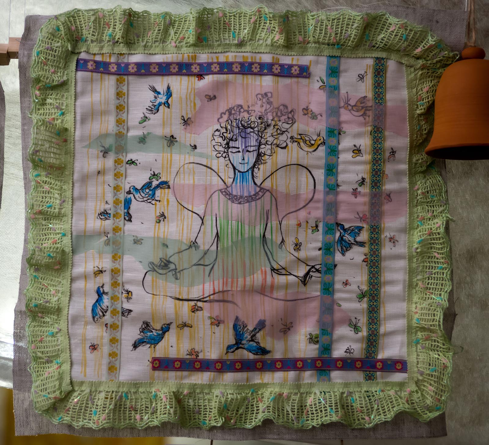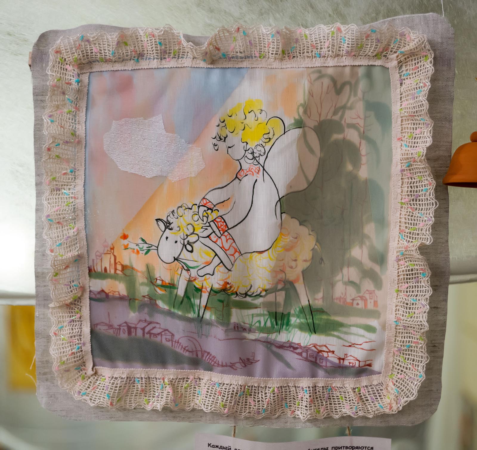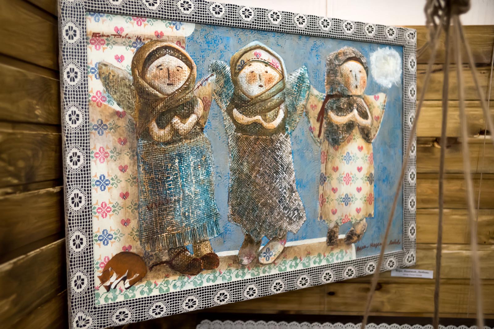 Фото №272726. Art16.ru Photo archiveТак, например, было с работами Галины Орловой. Сначала были сделаны картиночки на подрамниках. Если бы мы оставили все как есть, то тема читалась бы в лоб. Мы начали думать, как усложнить подачу, привязывать к моим работам, появилась тесьма. С её помощью работы превратились в пасхальные ангельские думки, и вместе с этим была решена тема семьи, любви и детей.