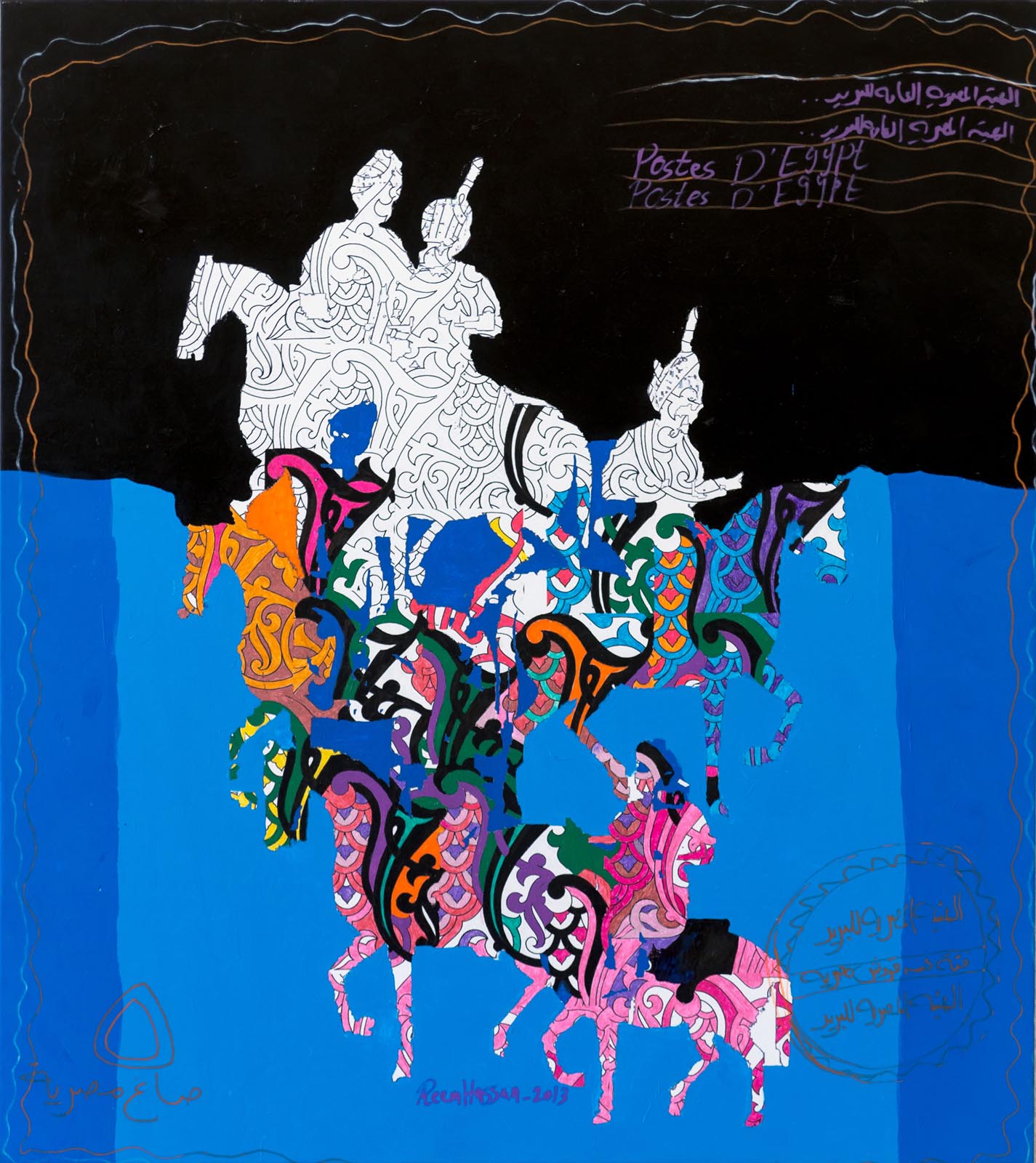 Фото №293699. Art16.ru Photo archiveРим Хассан, художница из Александрии создала свою марку в 2013 году, когда в Египте были беспорядки. Черным цветом, не свойственным её творчеству, обозначила состояние страны в тот момент. К марке приложила письмо на арабском языке, в котором описала события, происходившие на тот момент в Египте. К письму из Египта, приложена квитанция об оплате по доставке произведения.