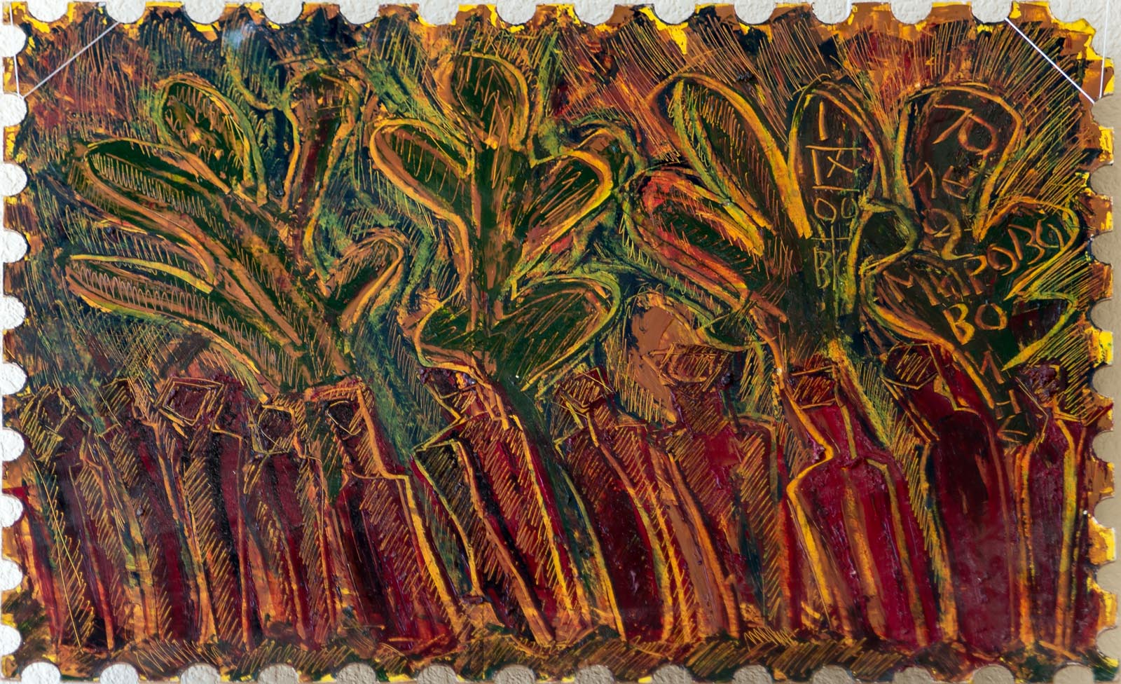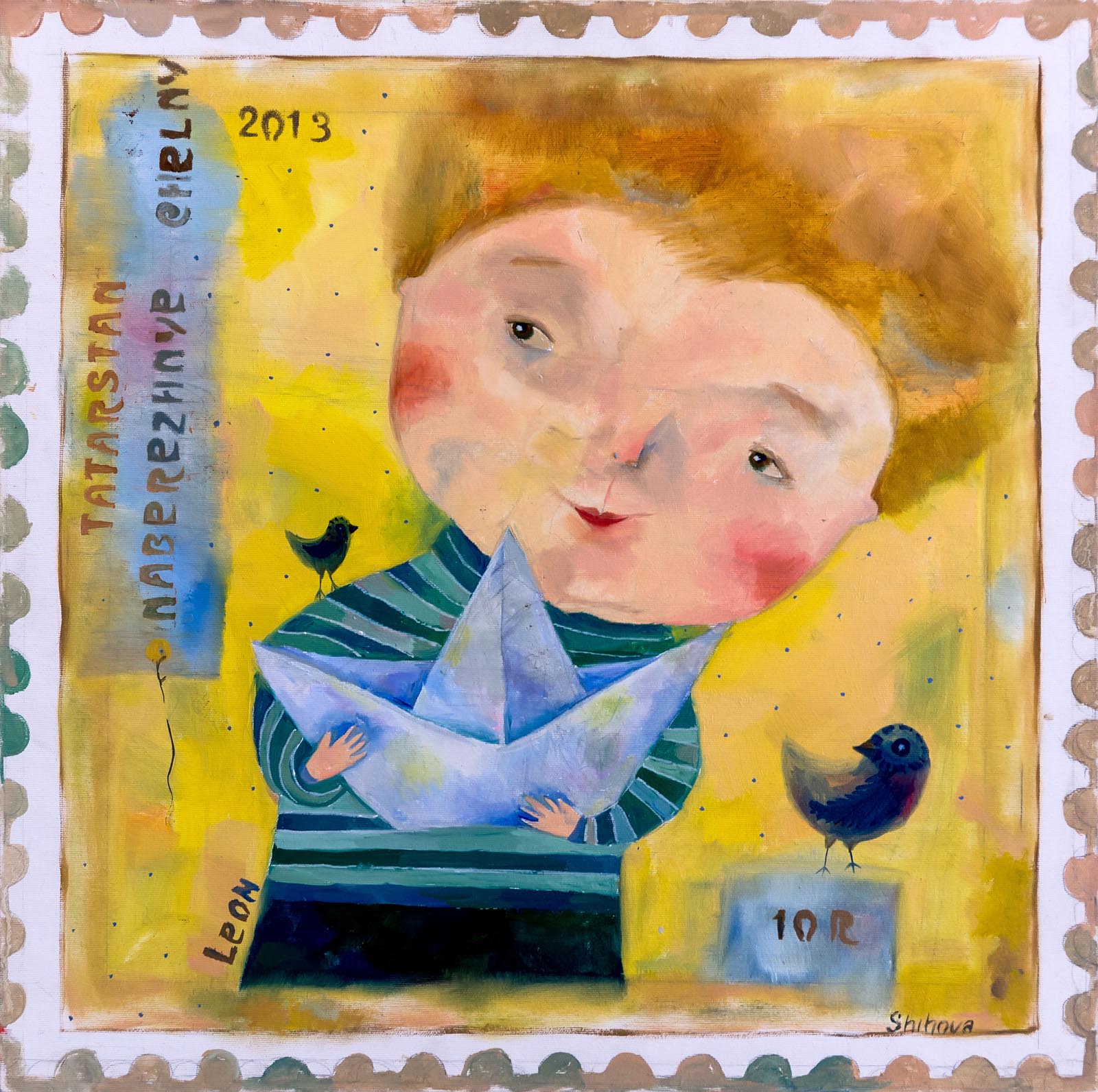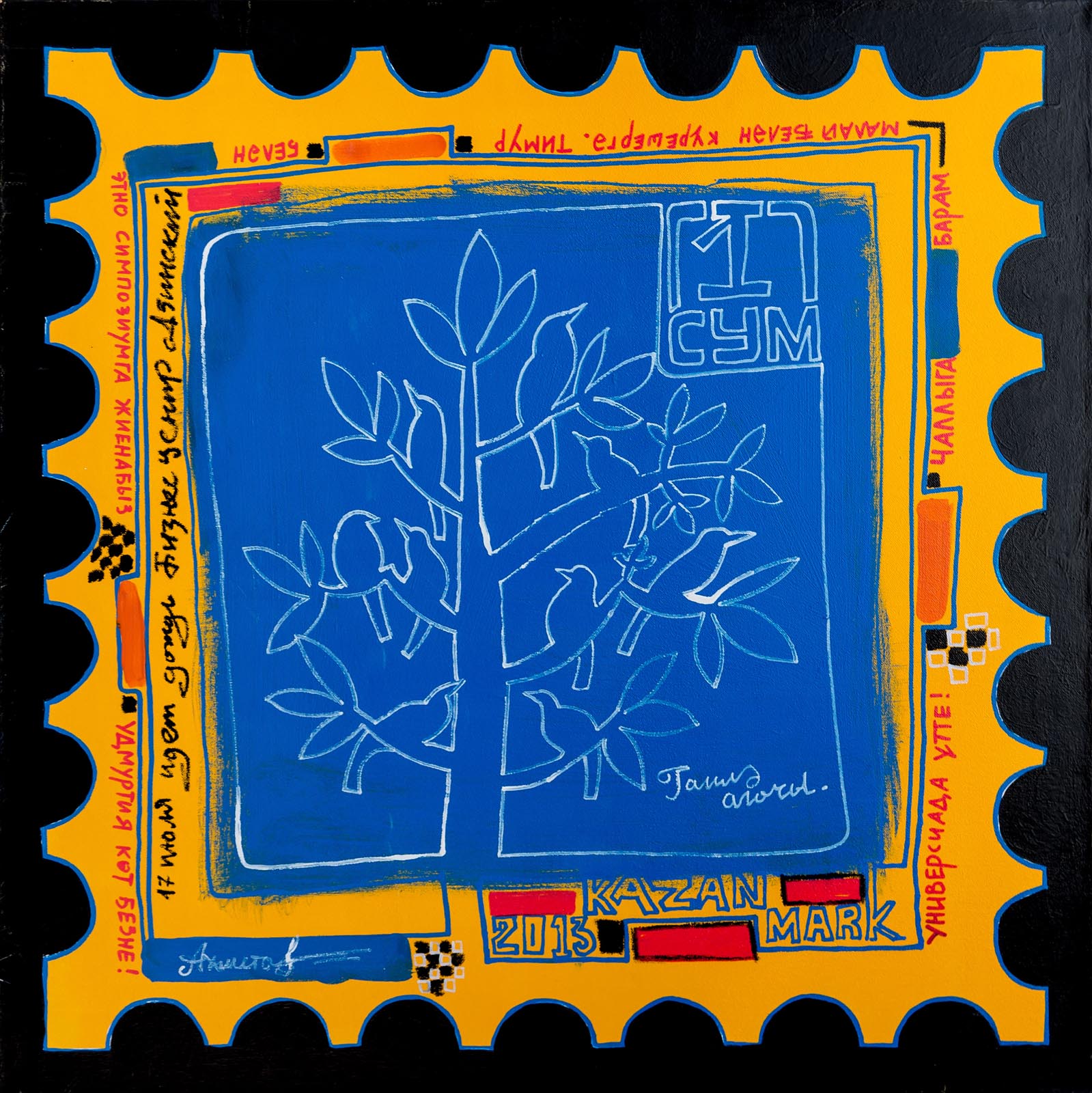 Фото №293463. Ленар Ахметов Набережные Челны КазаньПервая картина-марка появилась в промежутке между окончанием Универсиады и моей поездкой в Удмуртию на Этно-футуристическом фестивале фино-угорских народов. Марку написал быстро. Эта марка стала примером для составления художниками своей марки.