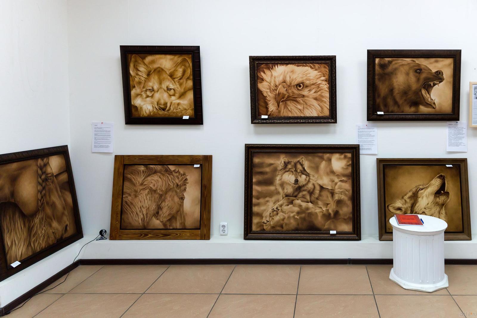Фото №739578. Art16.ru Photo archiveЧасть экспозиционного пространства принадлежит работам Ольги Пастернак, другая - анималистическим портретам, написанным Дмитрием.