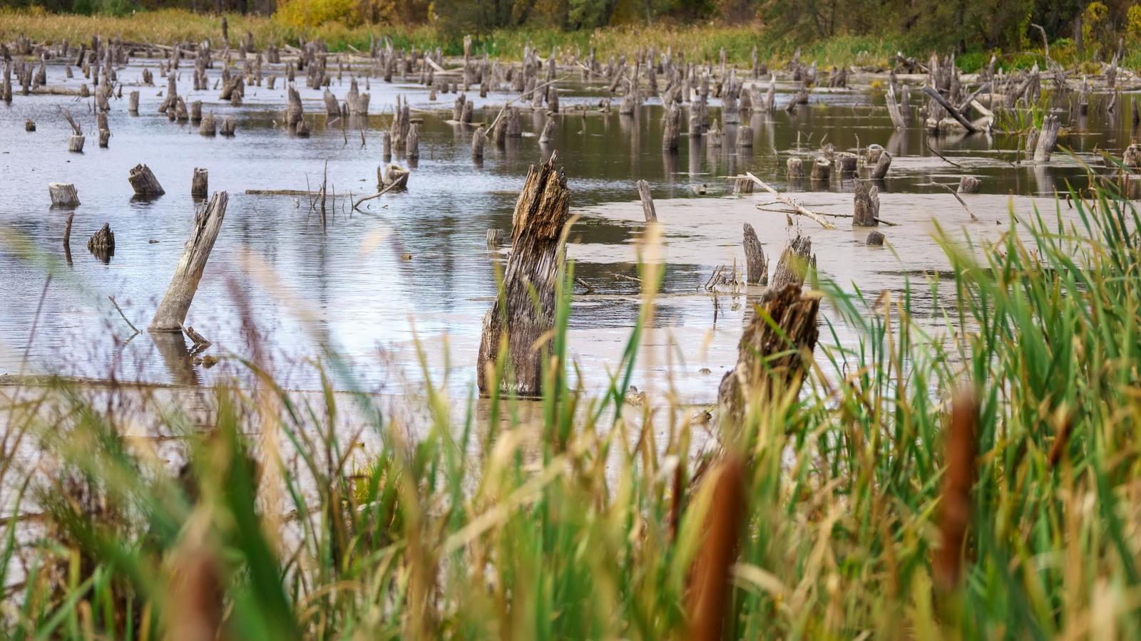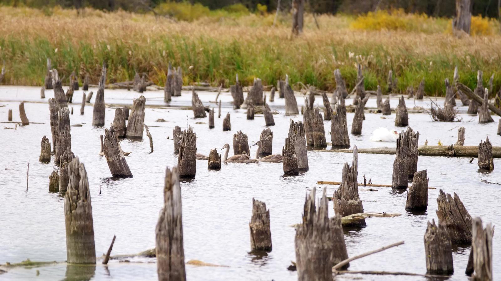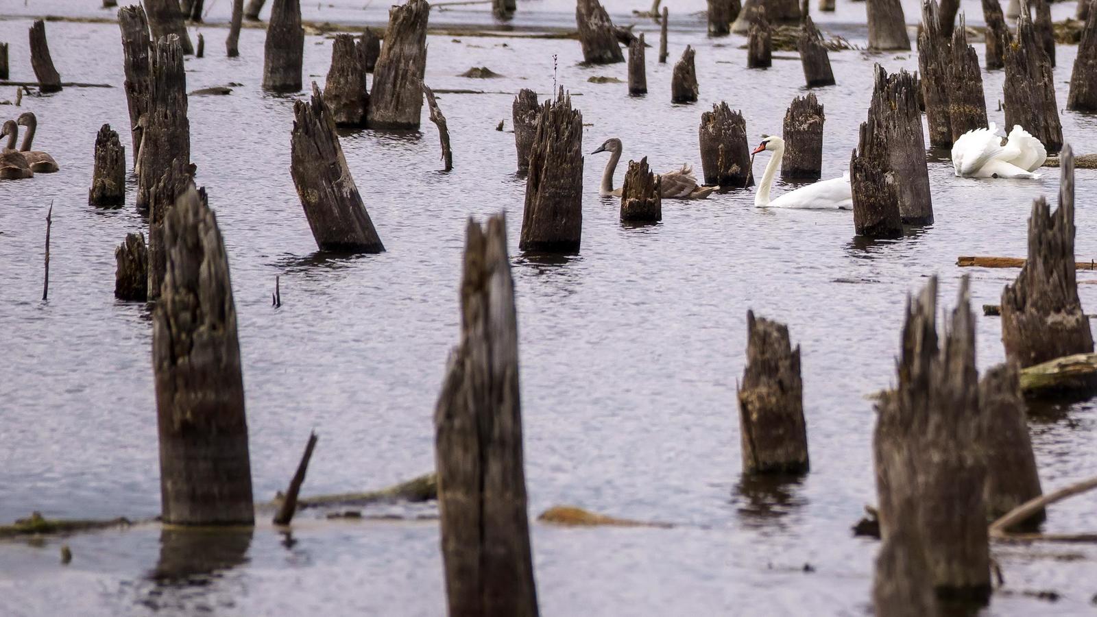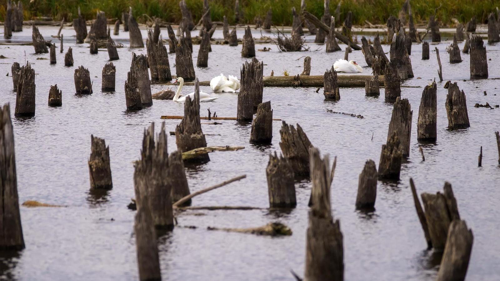Фото №992715. Art16.ru Photo archiveЭто место затонувшего леса. Мертвые сухие пни торчат над гладью озера. На поверхности тихой, светящейся серебром воды, между пнями, вижу узнаваемые очертания птиц. О, это лебеди! Важно фланируют парами. О, нет, не фланируют. У птиц есть цель, они плавают в поисках пищи. Чистят перышки. В общем, облюбовали это место. Улетят ли? Скоро холода.