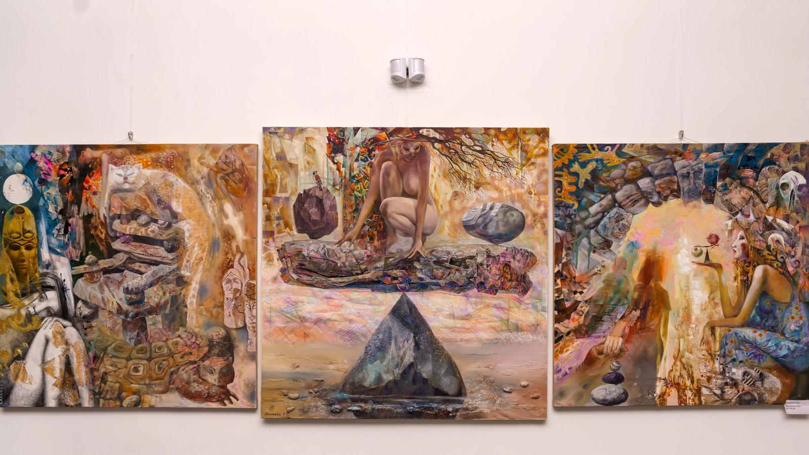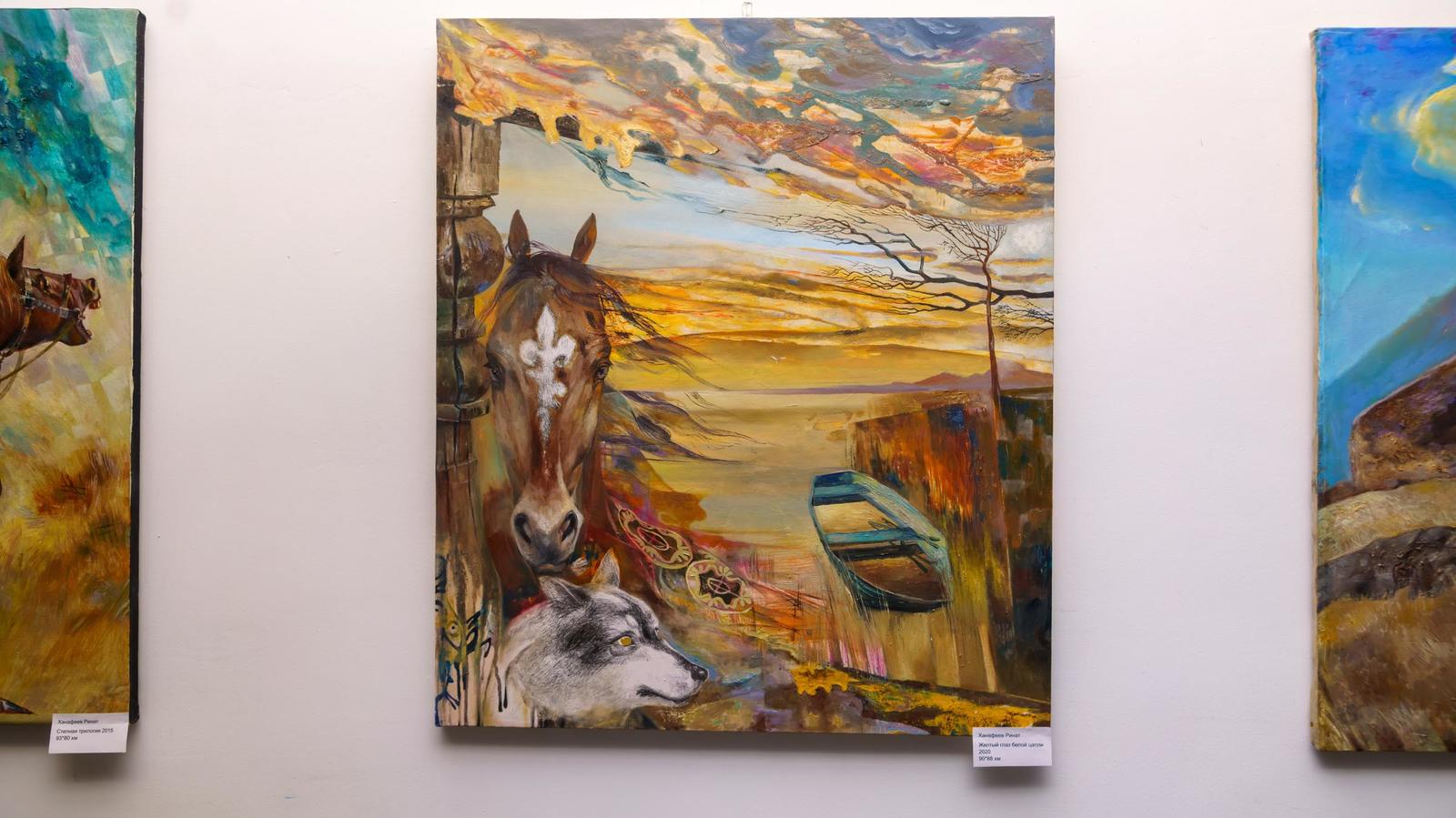 На выставке представлено 43 работы. Картины с наскока не посмотришь, они глубокие и философские. В них надо вглядываться. Художественные произведения Р.Ханафеева наполнены деталями, символами, аллегориями. Невероятно много женских образов, чувствуется, что женщина - вдохновительница, муза художника. Другими источниками, питающими его творчество, стали кони и степной ветер.